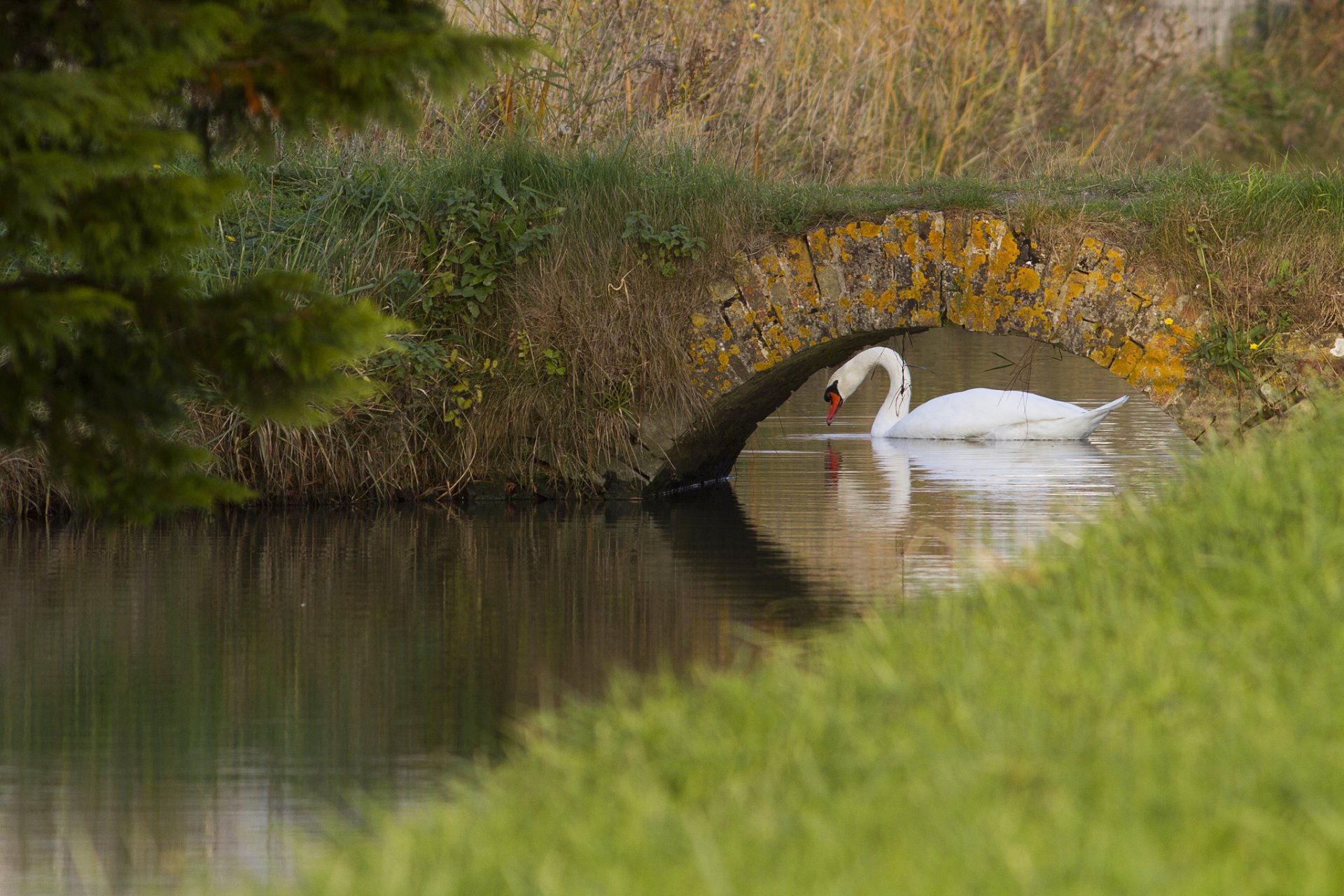 Pont envahi par la végétation sur la rivière, cygnePont envahi par la végétation sur la rivière, cygne