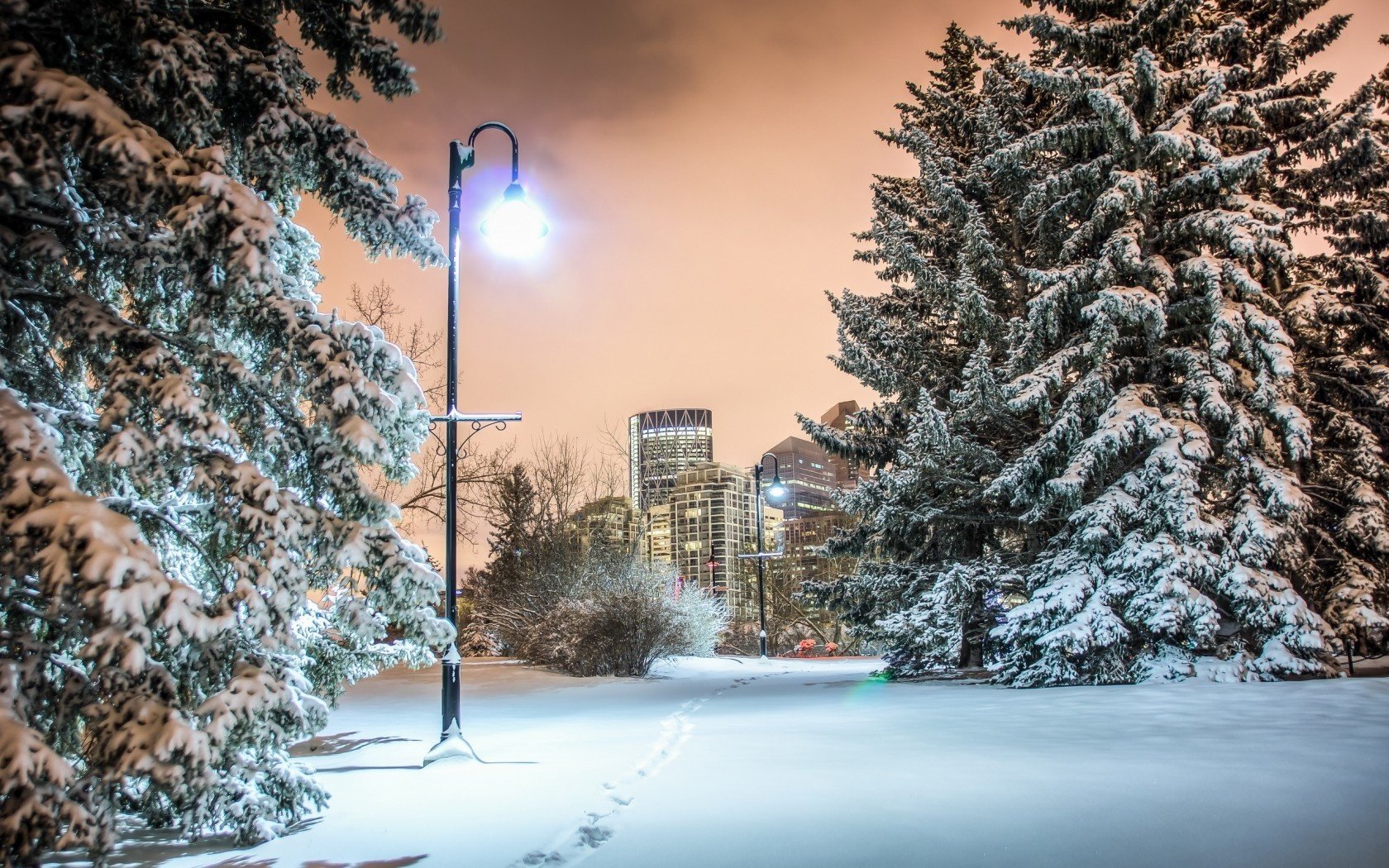 Lumière de lanterne solitaire dans le parc de la ville enneigéeLumière de lanterne solitaire dans le parc de la ville enneigée