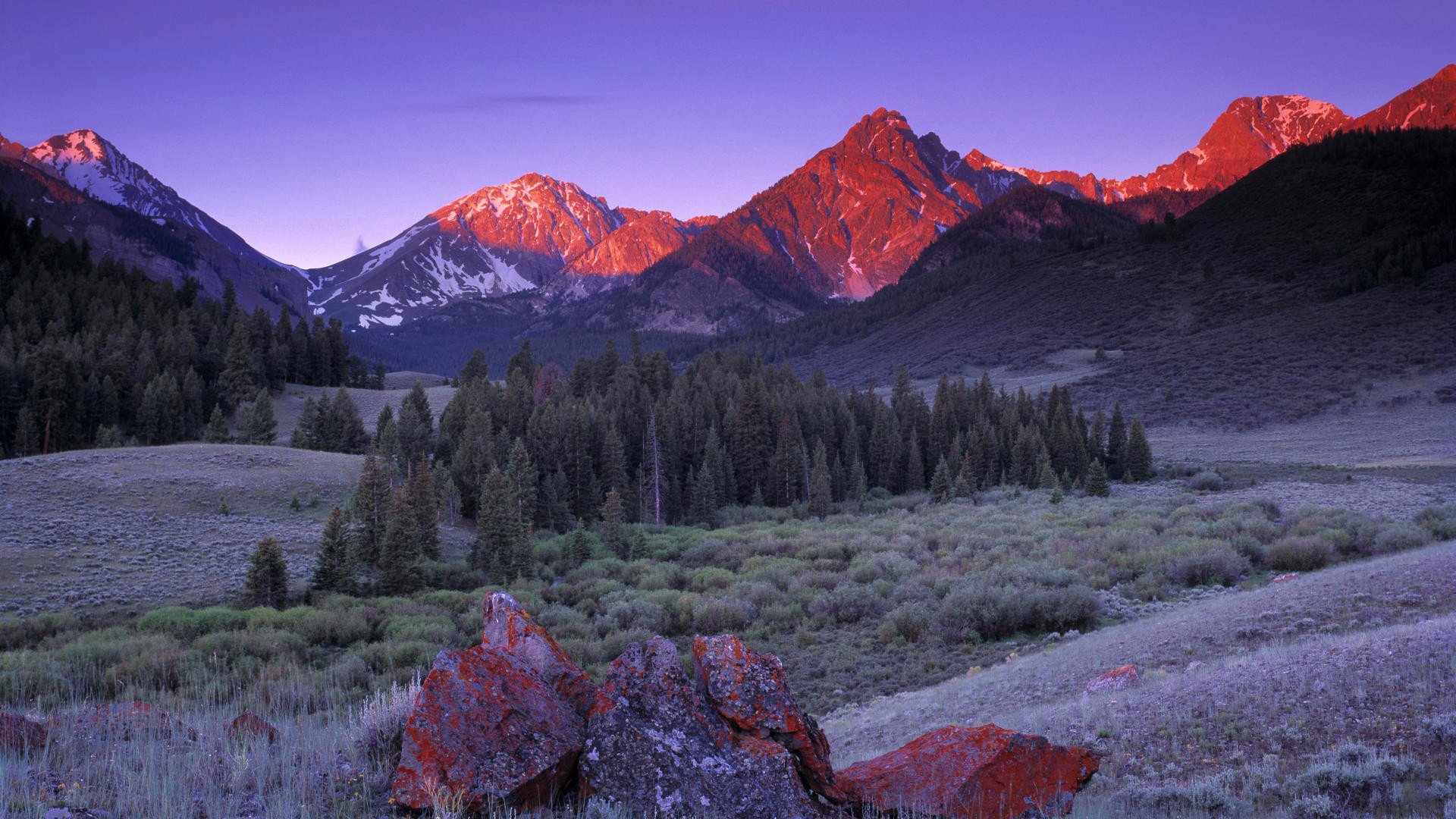 Vallée des montagnes près de la rivière au coucher du soleilVallée des montagnes près de la rivière au coucher du soleil