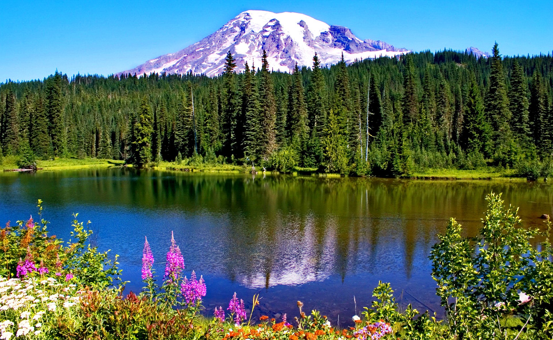 Parc national au canada avec des montagnes, un lac et des fleurs