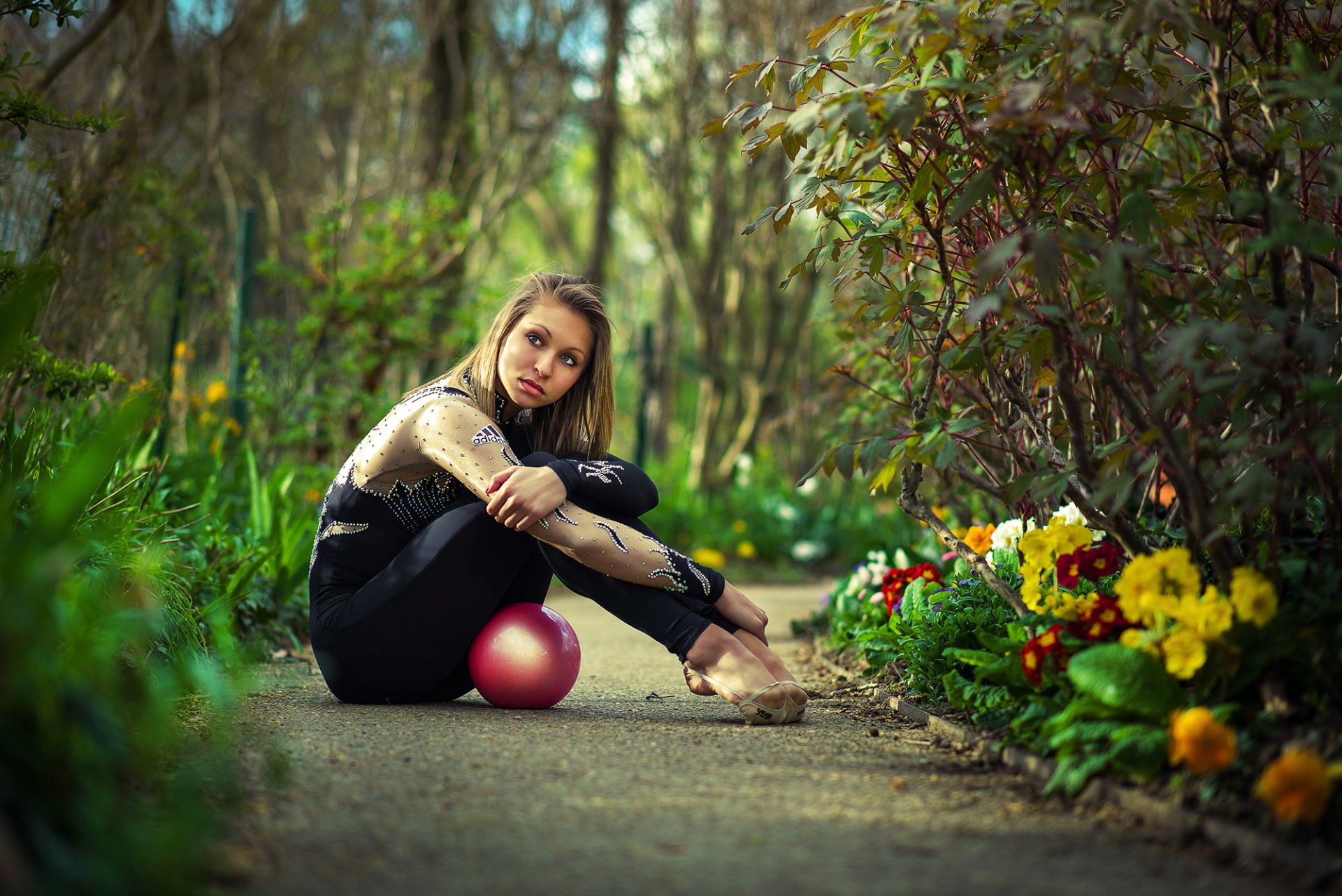 Photo de gymnaste artistique avec ballon dans le jardinPhoto de gymnaste artistique avec ballon dans le jardin