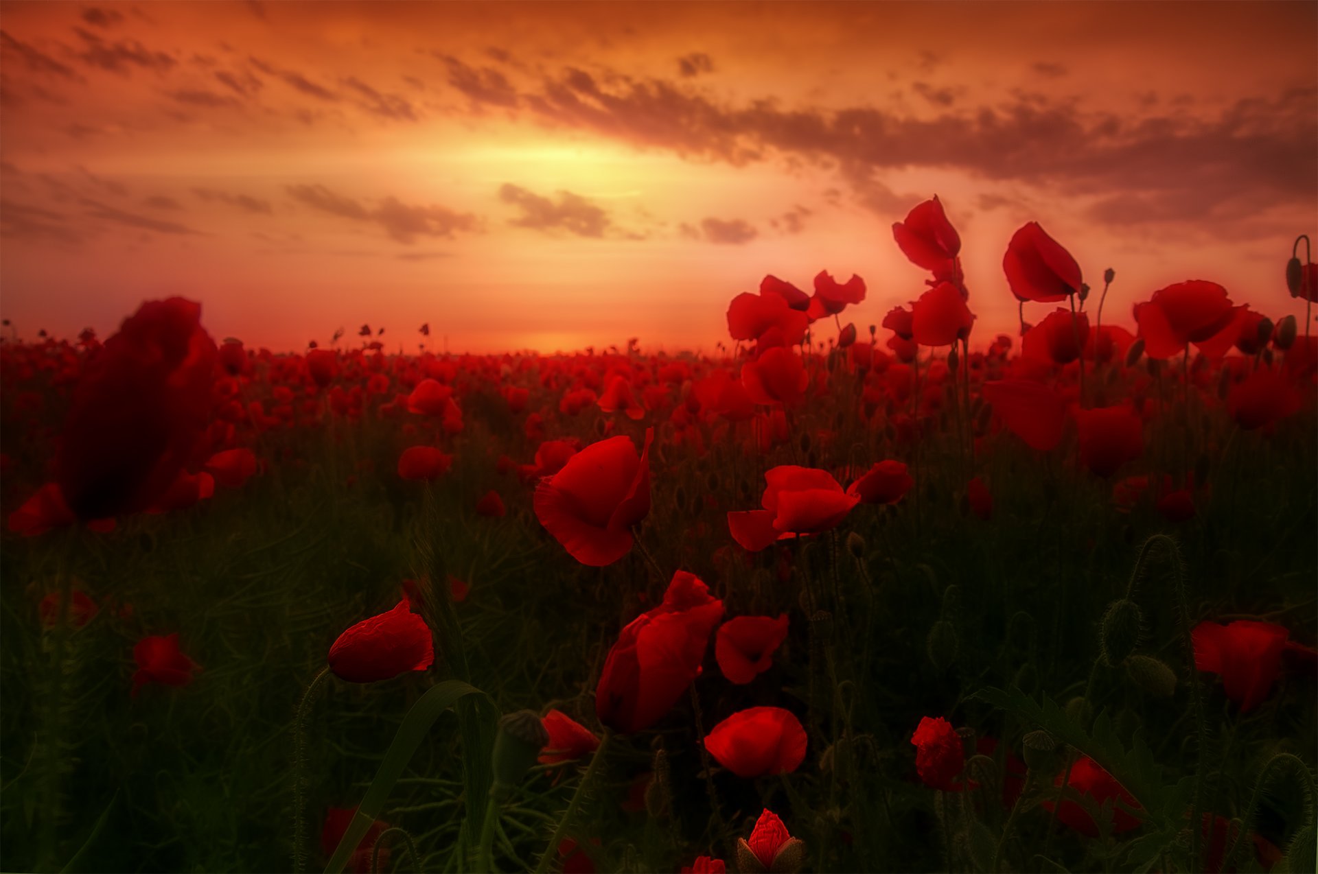 Coucher de soleil orageux sur le champ de pavot