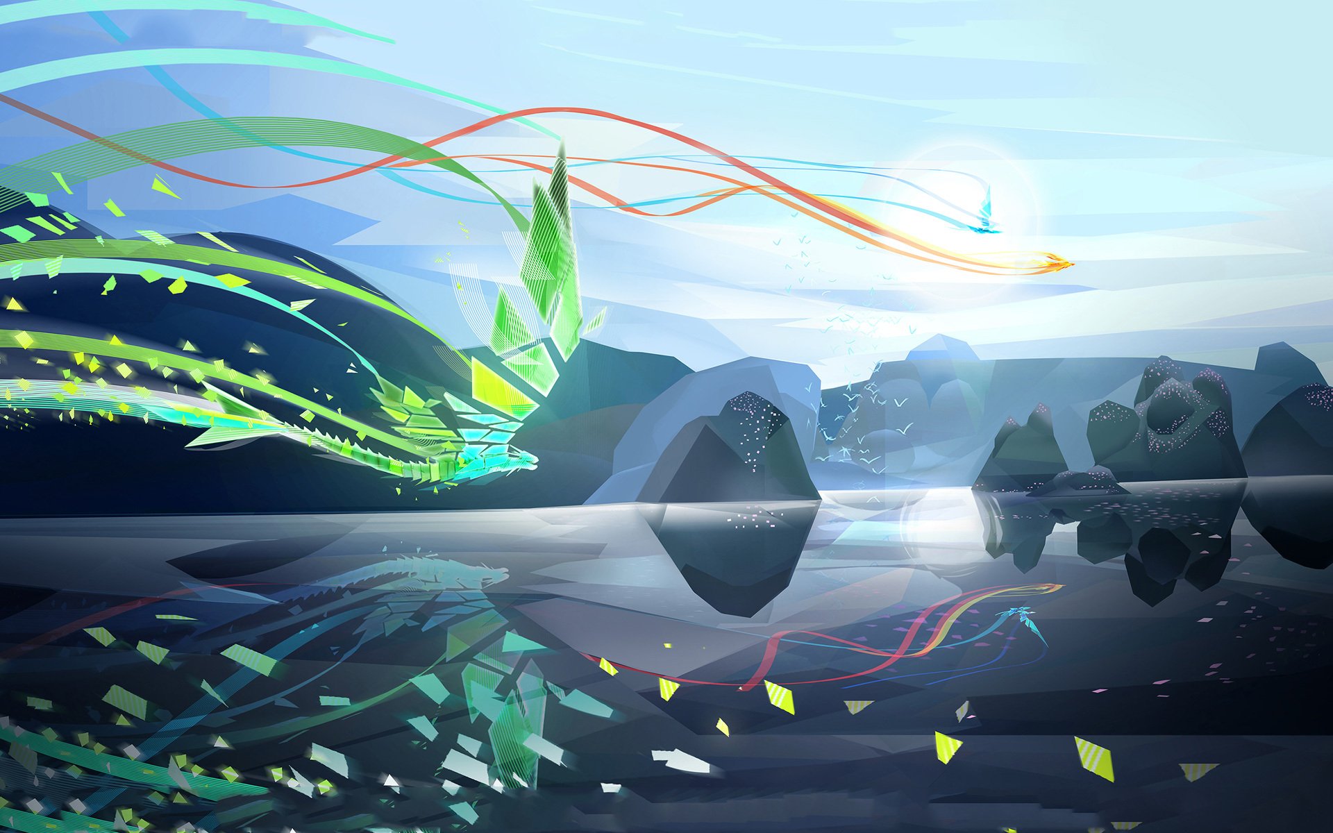 Art futuriste avec une fille rousse en hauteur parmi les oiseaux avec une épée céleste dans la ville des rêvesArt futuriste avec une fille Rousse en hauteur parmi les oiseaux avec une épée céleste dans la ville des rêves