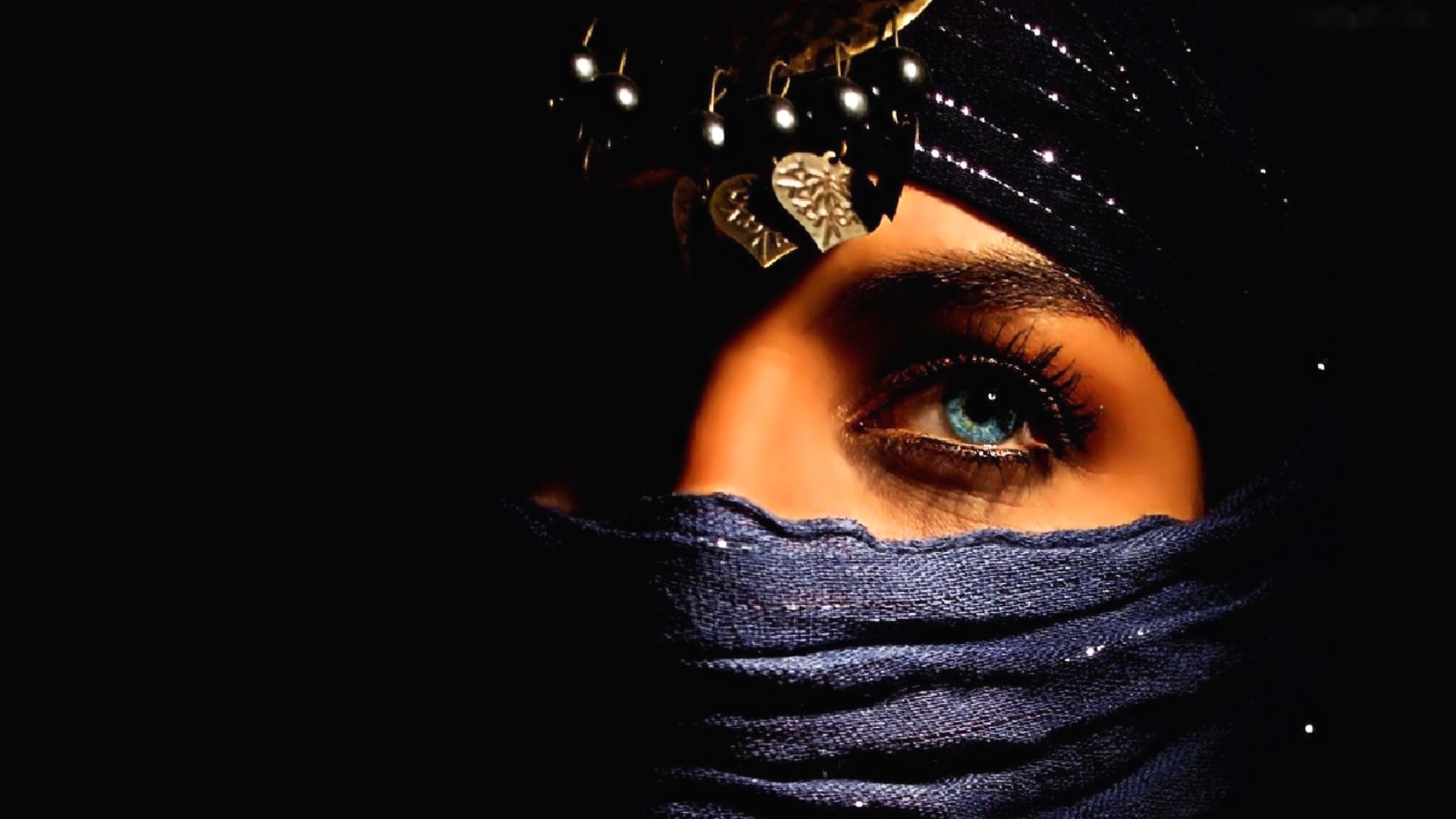 Oriental fille dans un foulard avec des yeux bleusOriental fille dans un foulard avec des yeux bleus