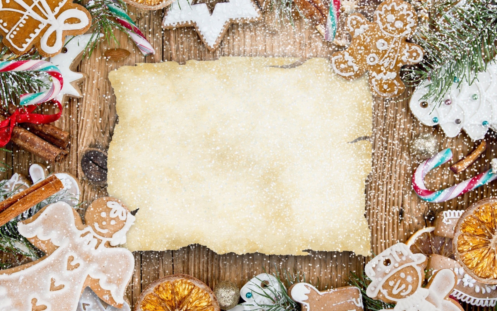 Jouets de noël sur une table en bois autour d'une feuille blanche pour les félicitationsJouets de Noël sur une table en bois autour d'une feuille blanche pour les félicitations