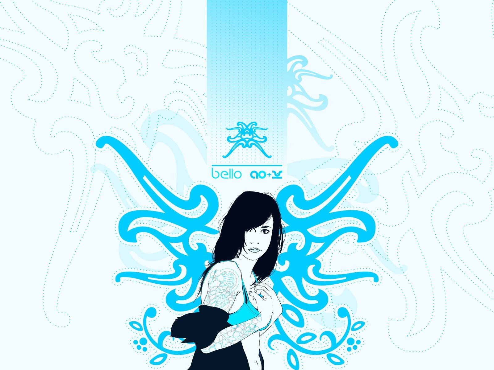 Fille avec des tatouages sur le bras sur fond de motifs bleus