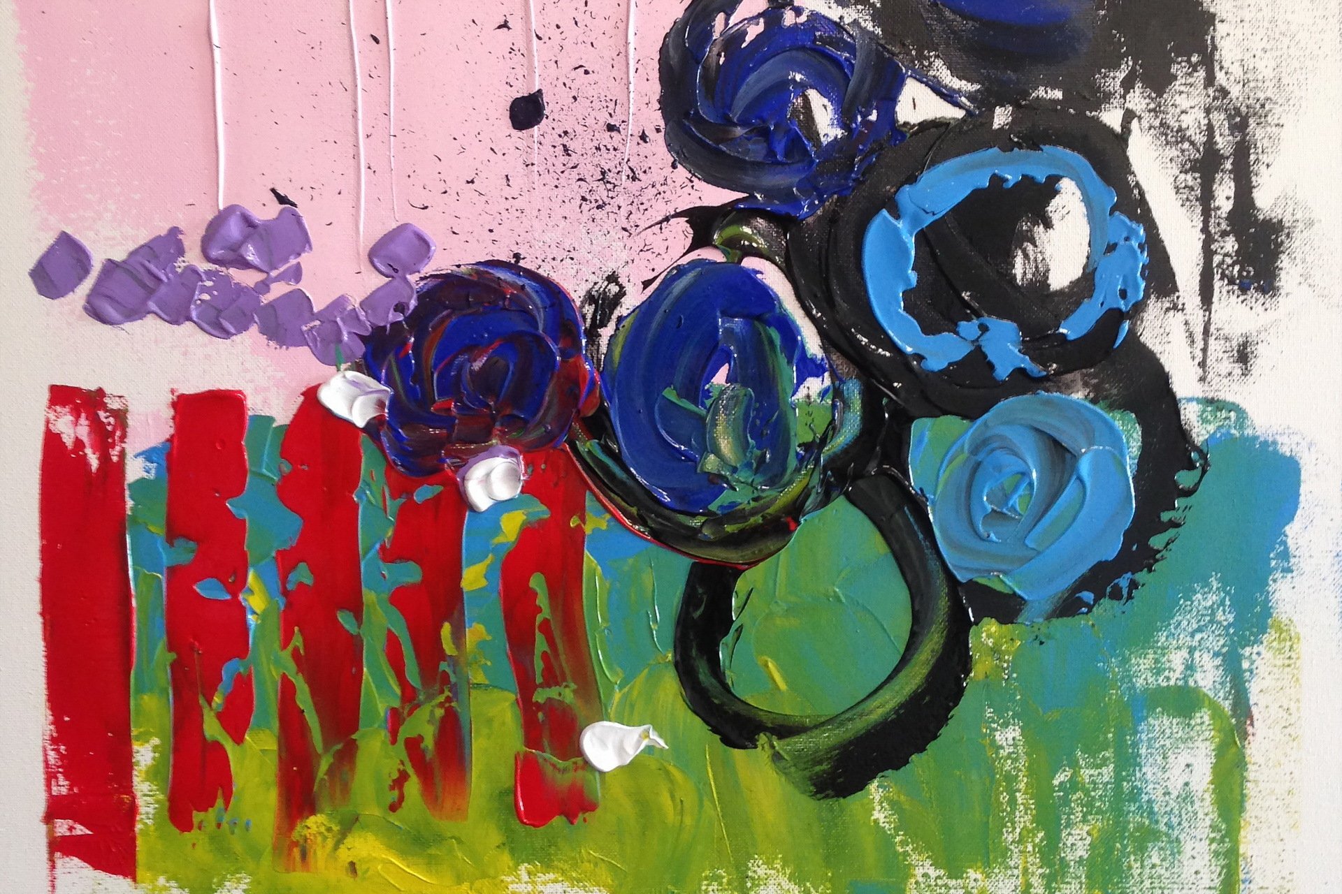 Peinture abstraite avec clôture rouge et cercles noirs et bleusPeinture abstraite avec clôture rouge et cercles noirs et bleus