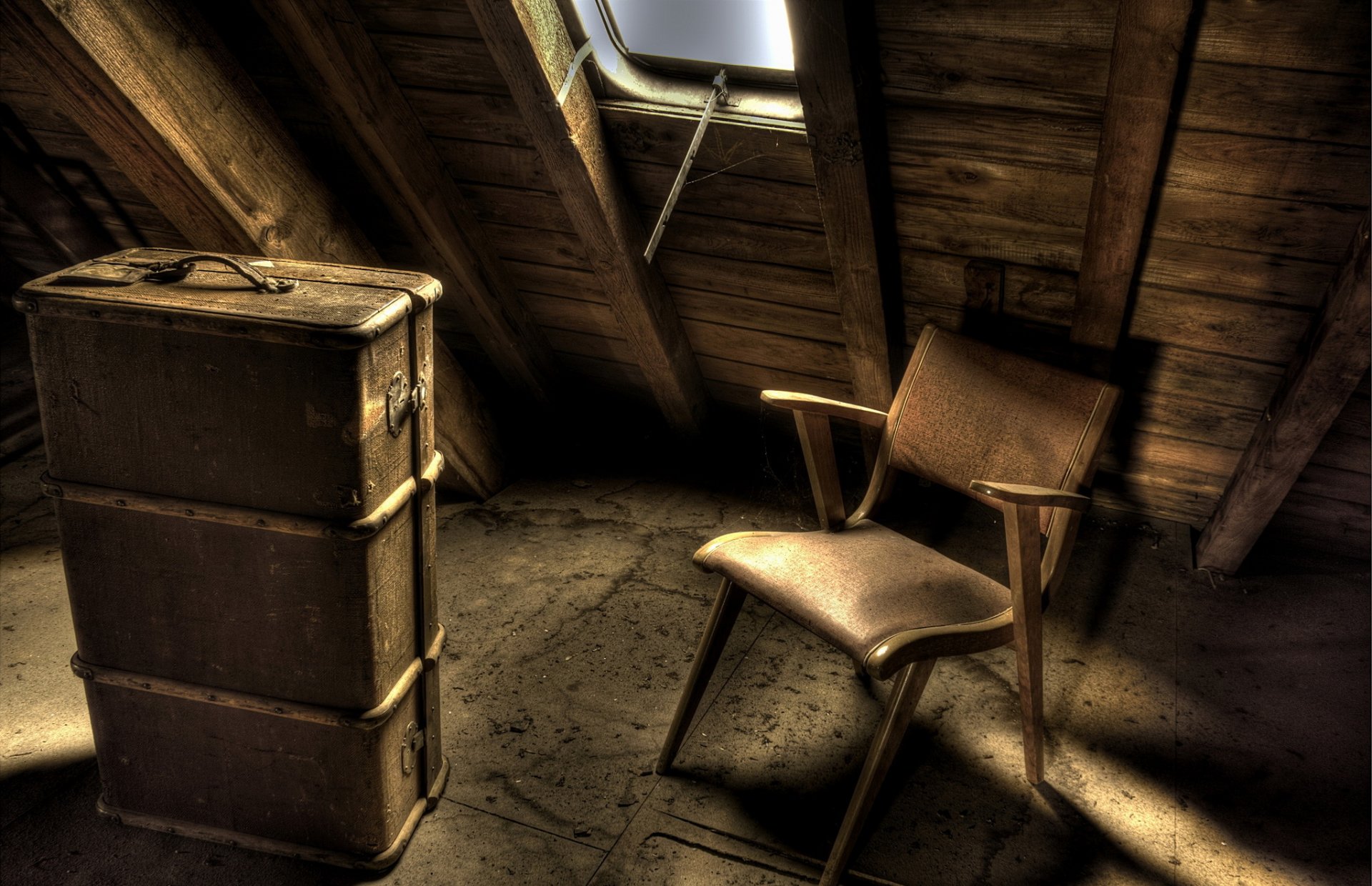 Valise sur une chaise dans le grenier dans les tons brunsValise sur une chaise dans le grenier dans les tons bruns