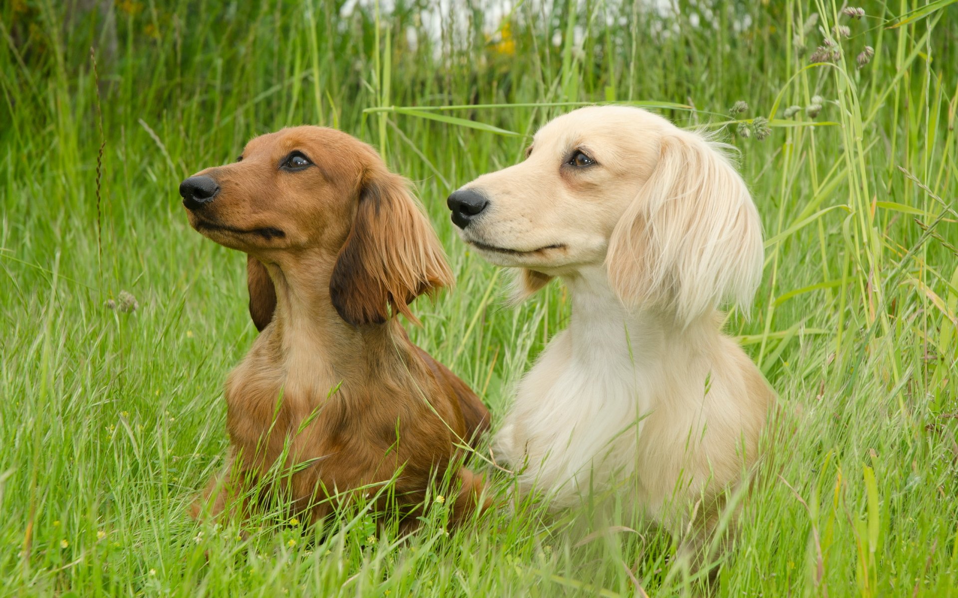 Deux teckels en été sur une promenade, assis dans l'herbe verteDeux teckels en été sur une promenade, assis dans l'herbe verte