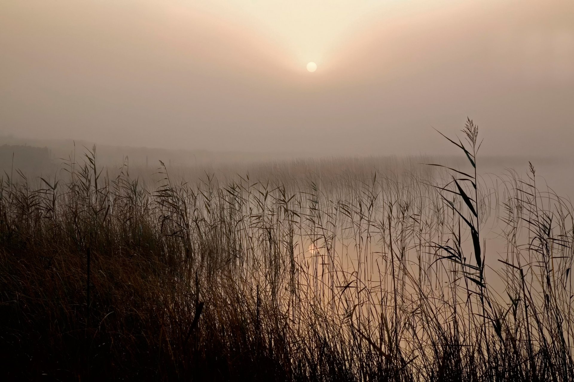 Roseaux au bord du lac dans le brouillard