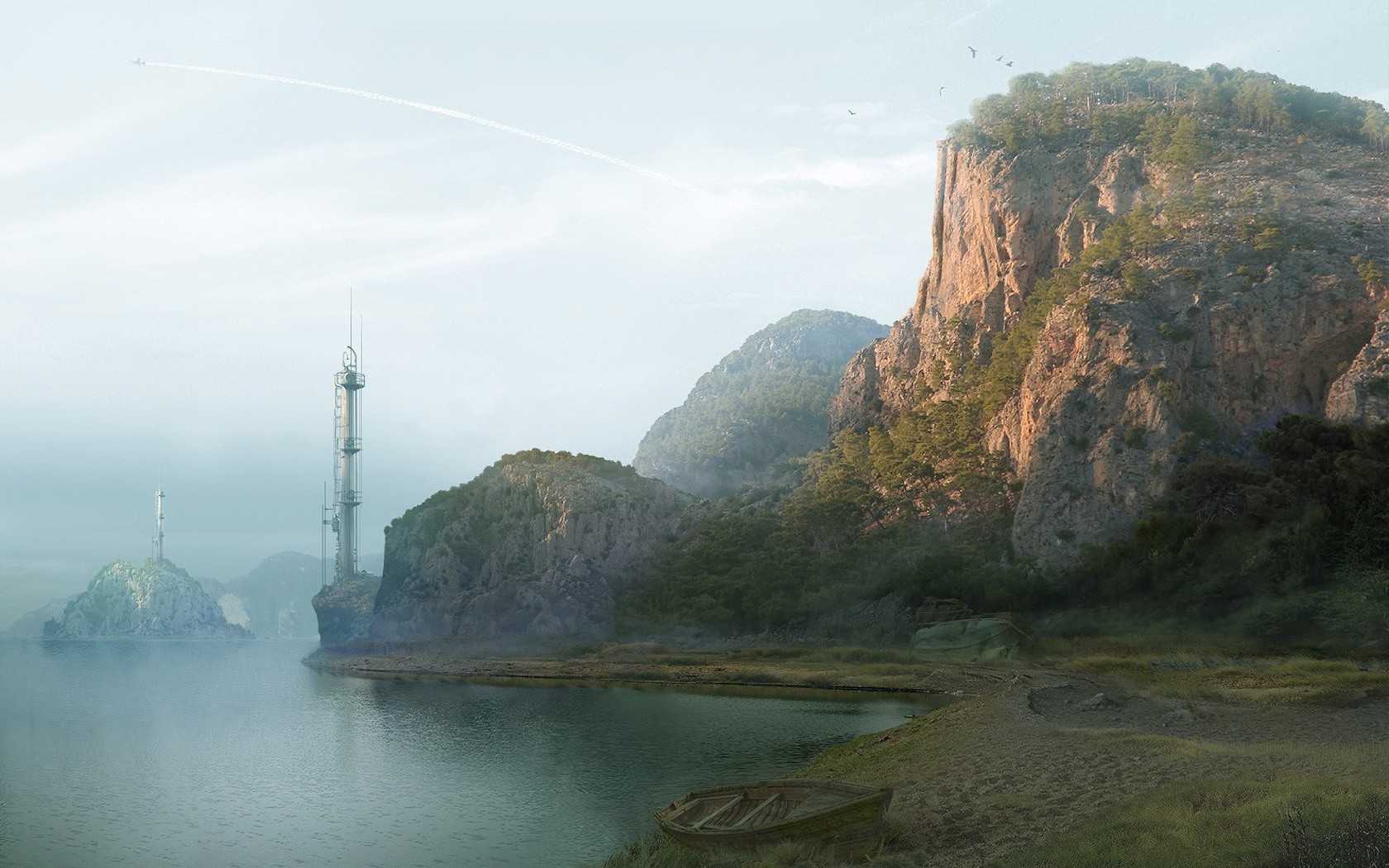 Quai sur le fond des champs et du village avec le clocherQuai sur le fond des champs et du village avec le clocher