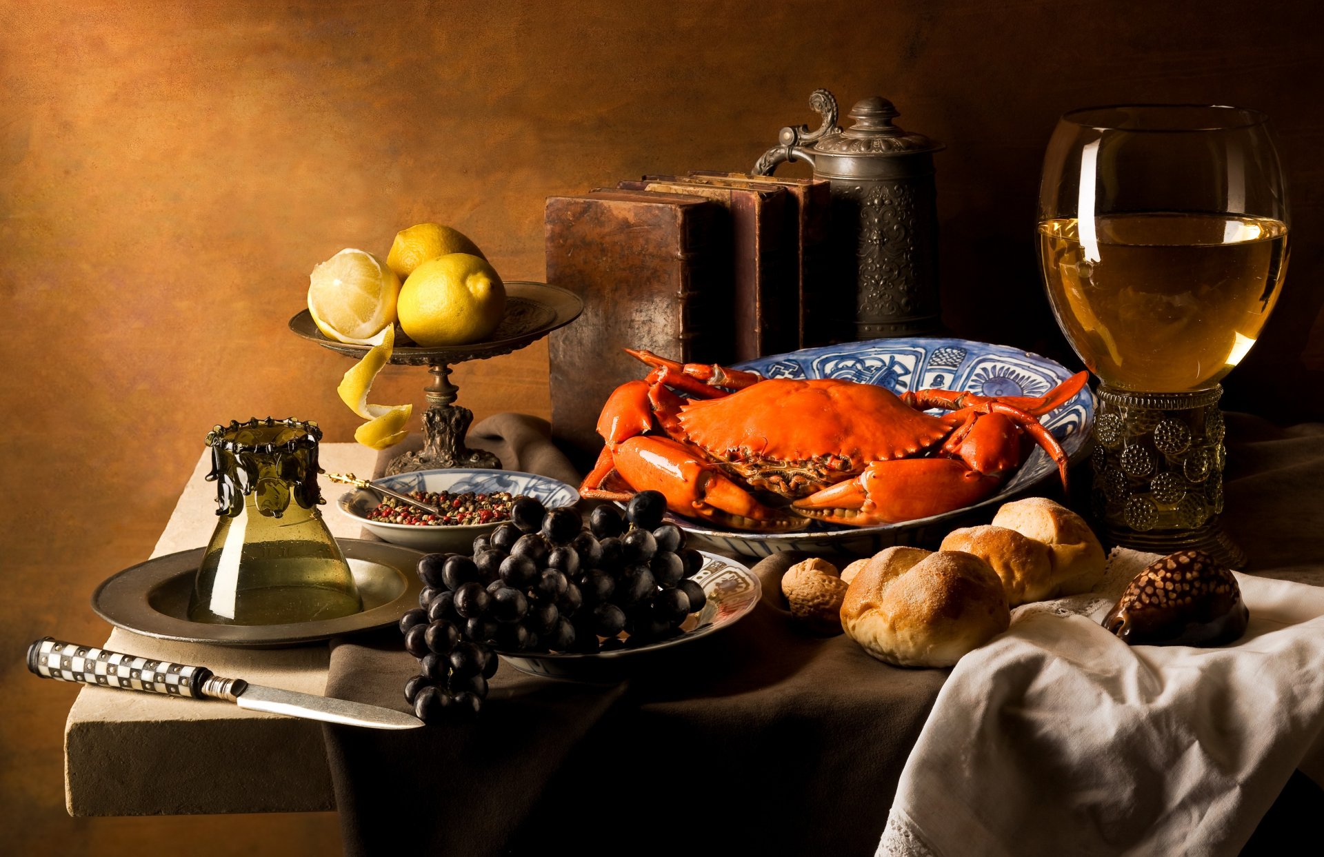 Crabe dans un plat sur la table avec des raisins, des citrons et une boissonCrabe dans un plat sur la table avec des raisins, des Citrons et une boisson