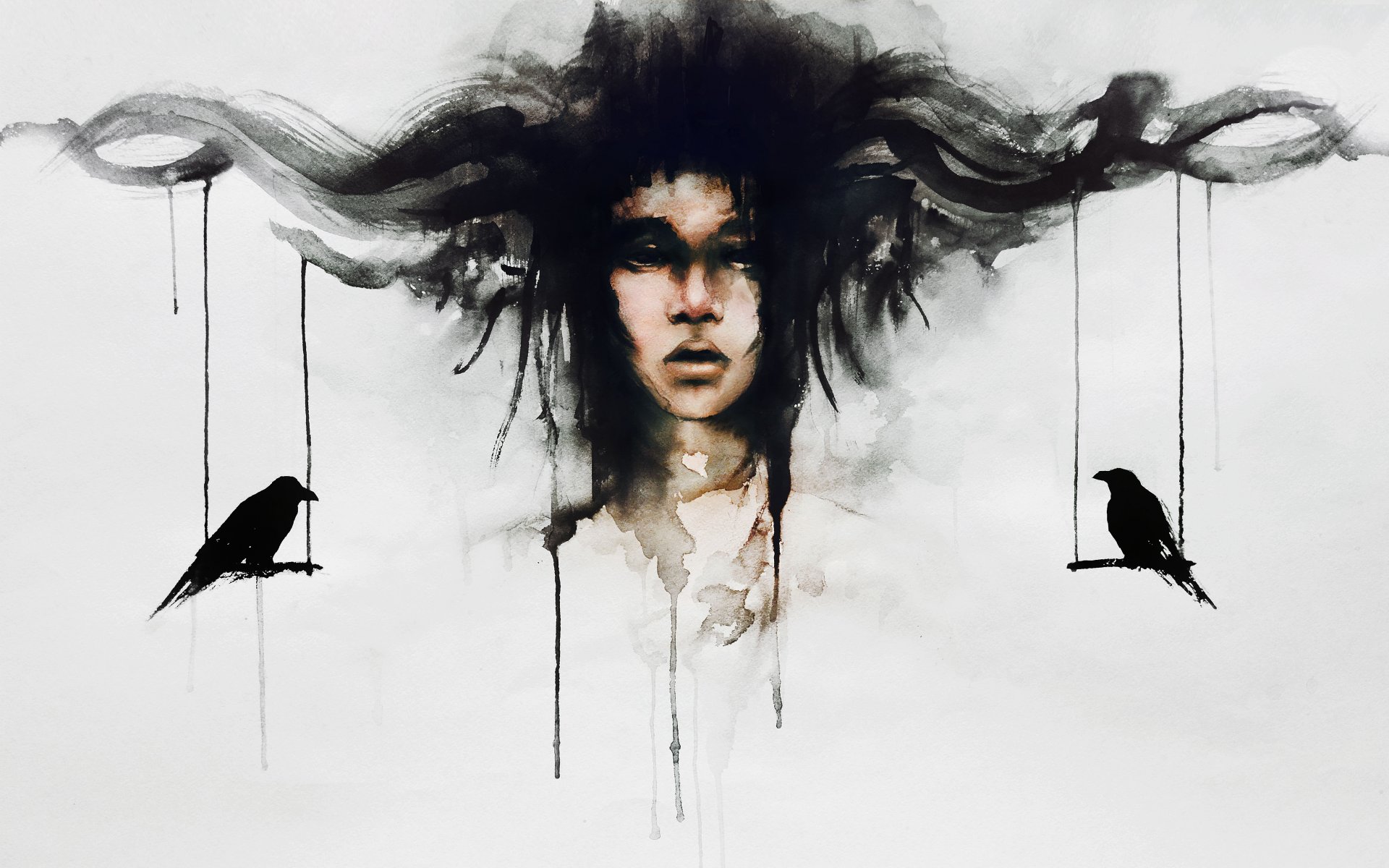 Portrait d'une jeune fille aux cheveux noirs sous la forme de balançoires et corbeaux assis sur euxPortrait d'une jeune fille aux cheveux noirs sous la forme de balançoires et corbeaux assis sur eux