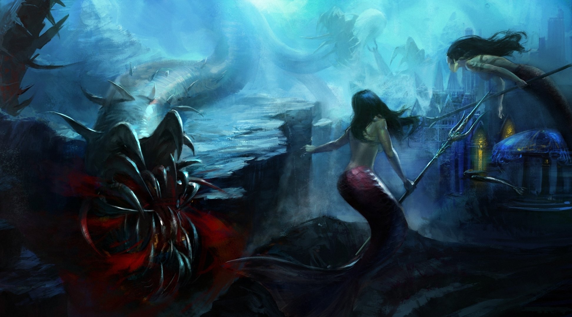 Monde sous-marin avec des sirènes tenant une lance à la main, entouré de monstresMonde sous-marin avec des sirènes tenant une lance à la main, entouré de monstres