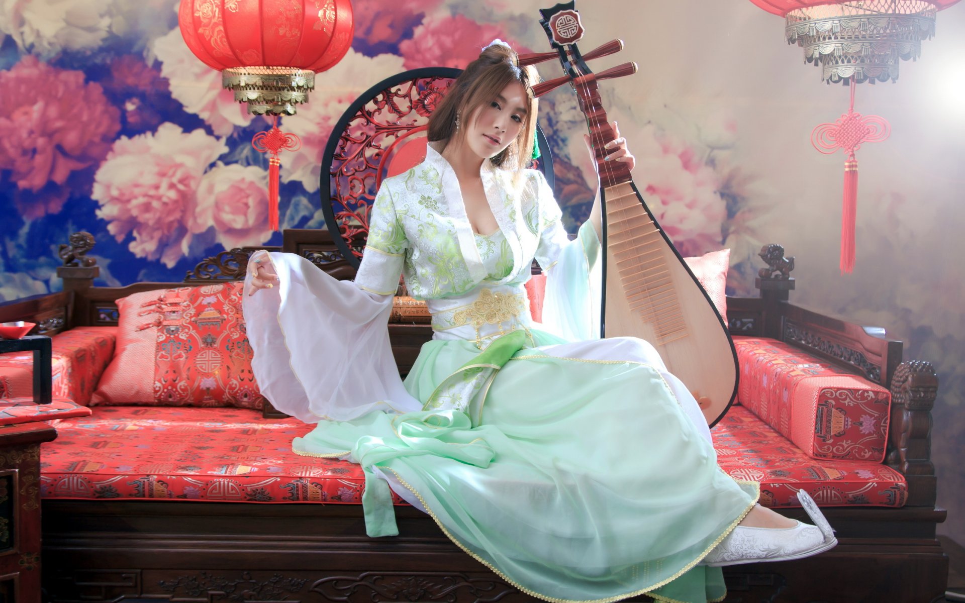 Fille asiatique en robe blanche et verte joue de la flûteFille asiatique en robe blanche et verte joue de la flûte