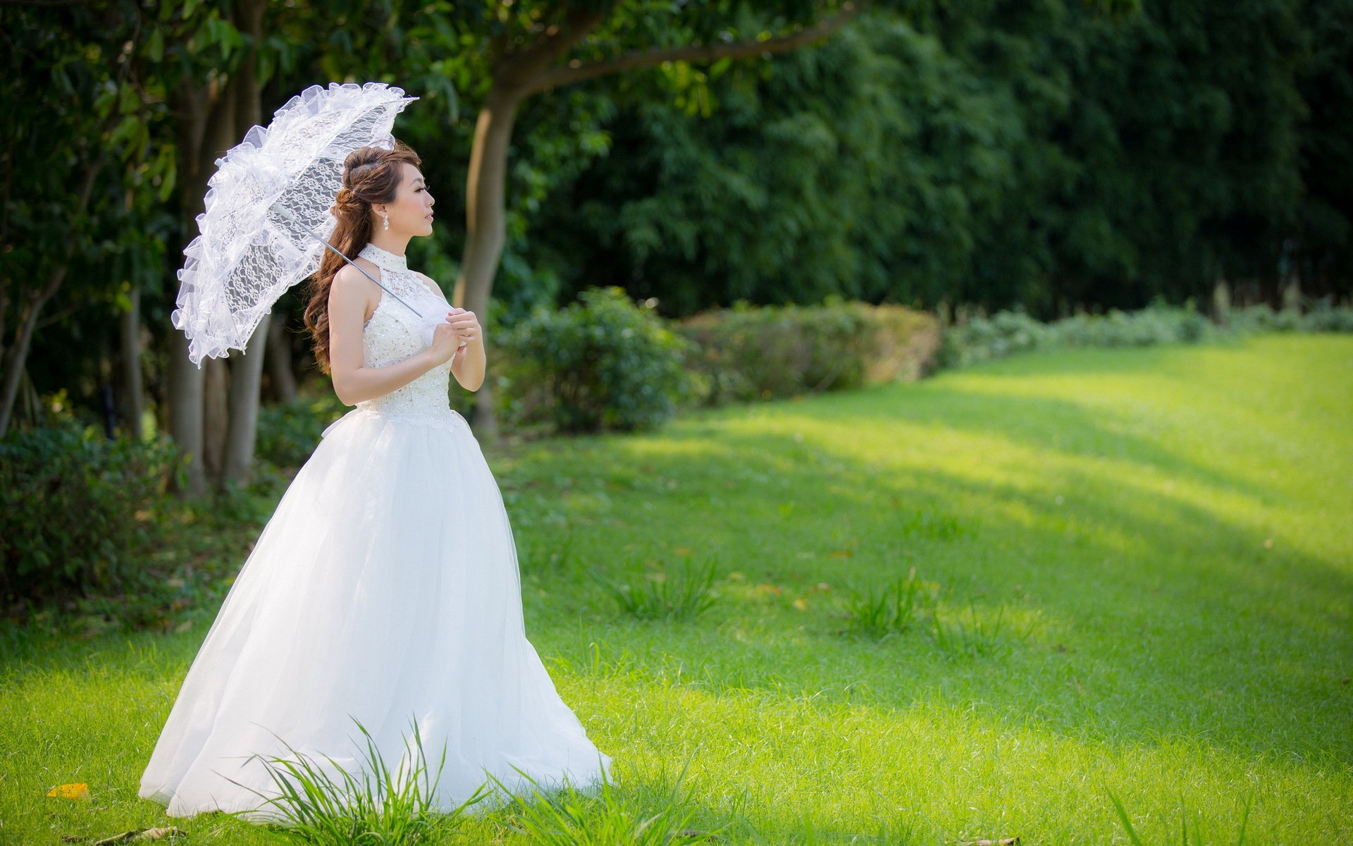 Fille asiatique en robe de mariée sous le parapluie d'été