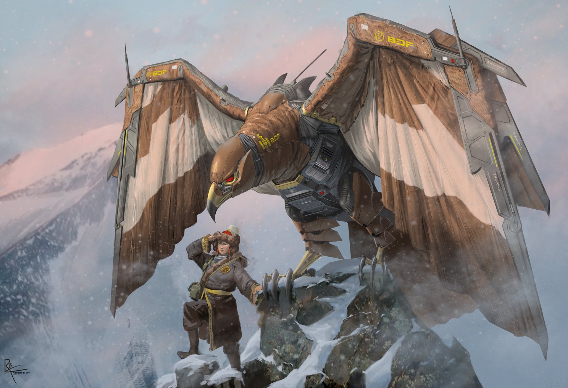 Oiseau aigle dans les rochers enneigés avec l'homme