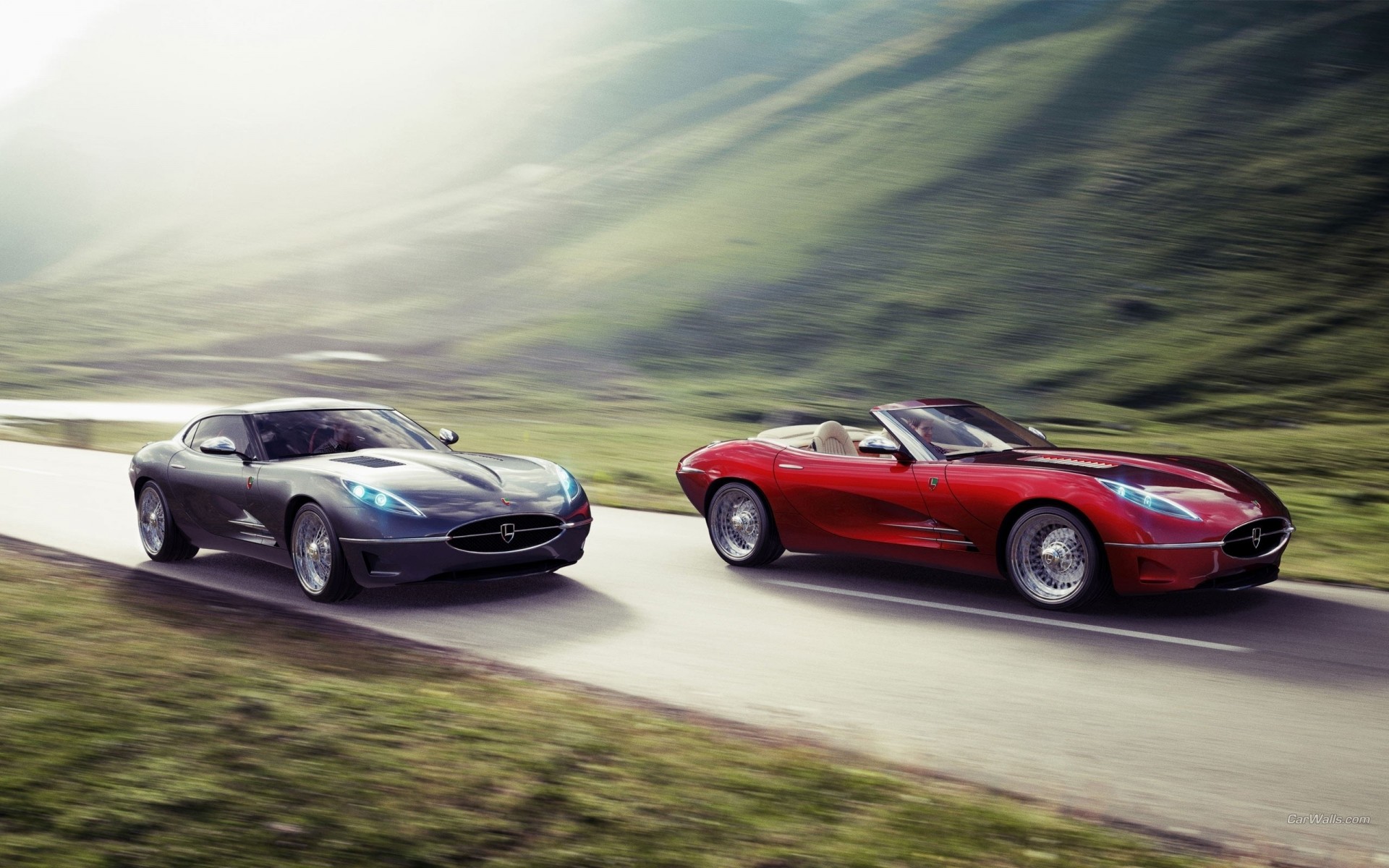 Autos "Dodge et Jaguar" sur la route de nuit.