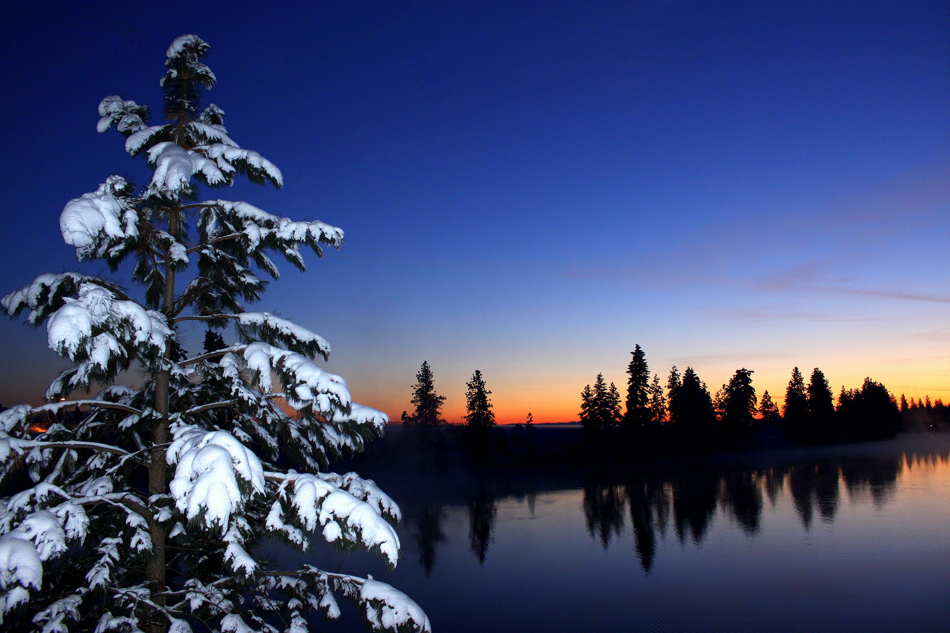 Arbre de noël enneigé sur fond d'eau et coucher de soleil rougeArbre de Noël enneigé sur fond d'eau et coucher de soleil rouge
