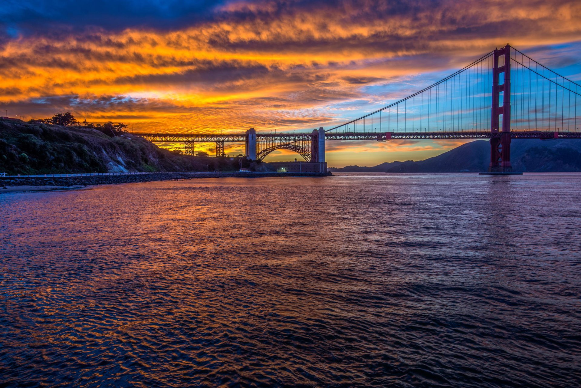 Golden Gate Bridge sur le Détroit au coucher du soleil