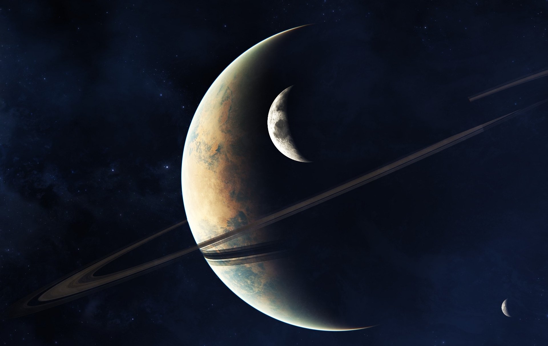 Planète avec des anneaux dans le ciel photo près des rochersPlanète avec des anneaux dans le ciel photo près des rochers