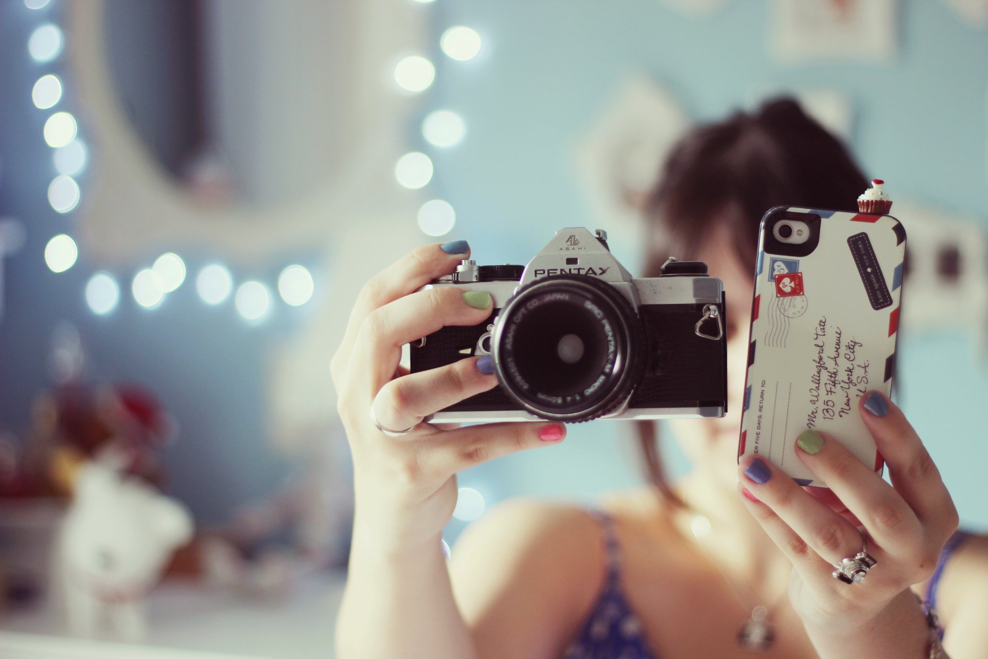 Casquette sur la fille. selfie sur l'appareil photoCasquette sur la fille. Selfie sur l'appareil photo