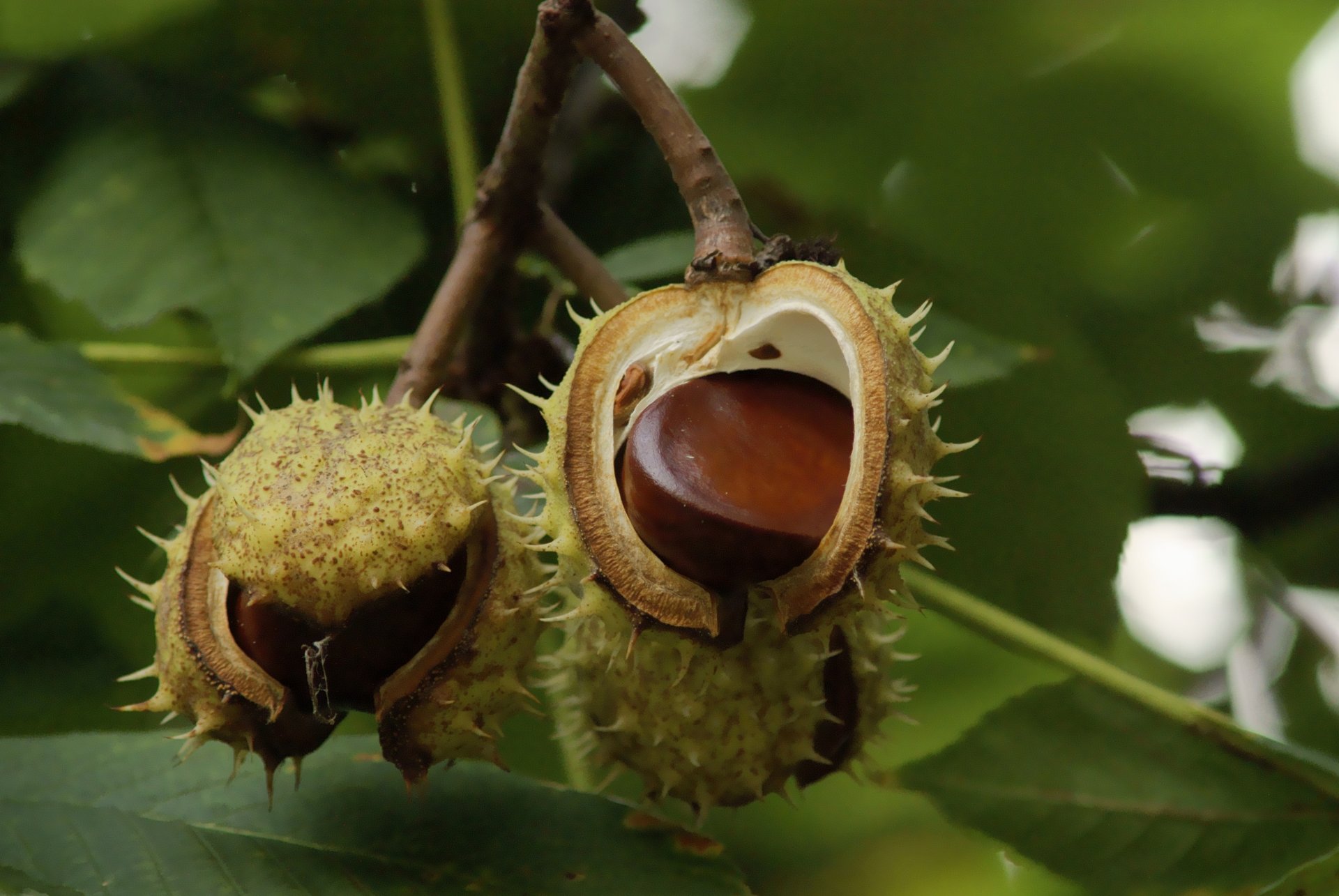 Châtaignes mûres sur une branche parmi le feuillageChâtaignes mûres sur une branche parmi le feuillage
