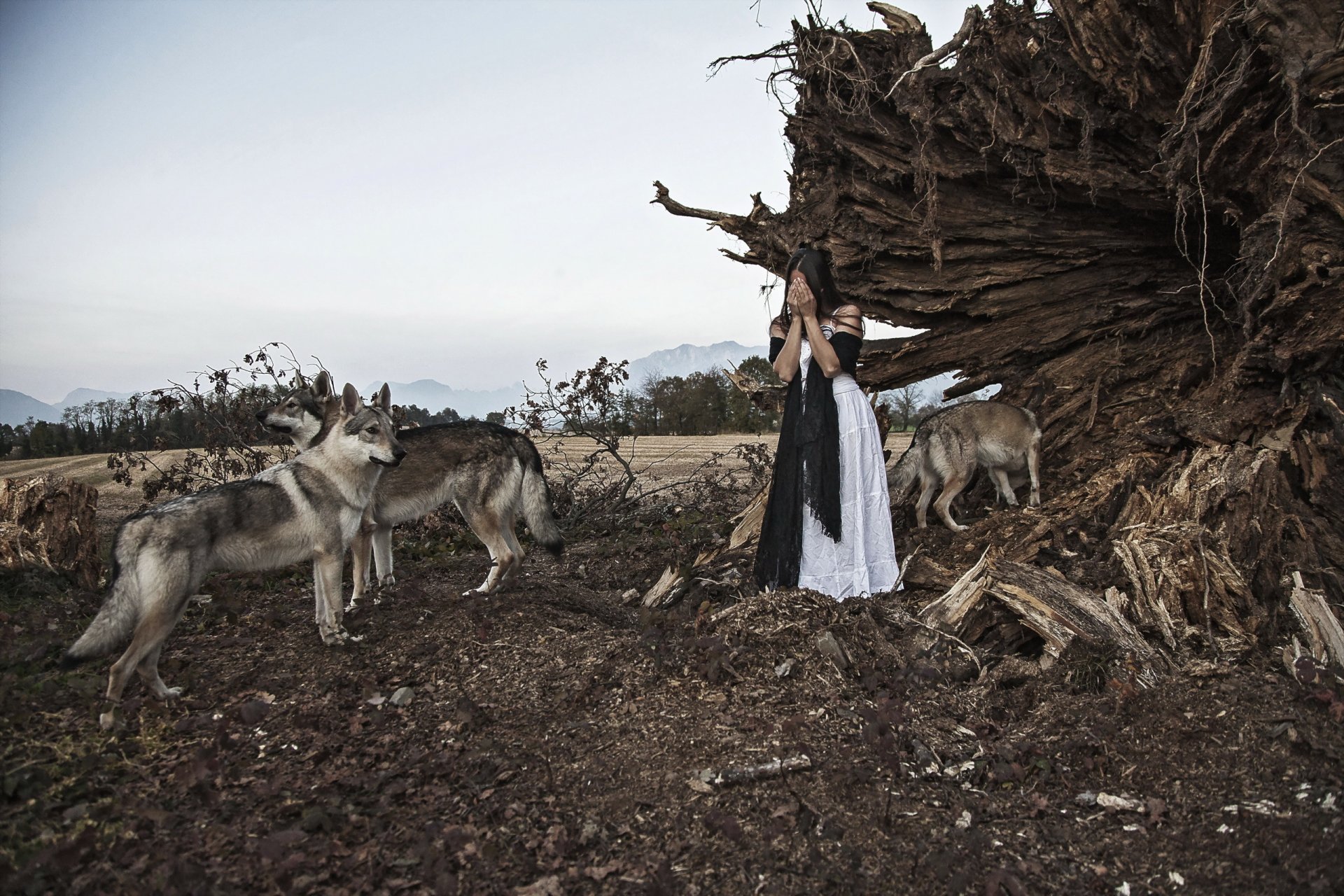 La jeune fille dans une situation dangereuse avec les loupsLa jeune fille dans une situation dangereuse avec les loups