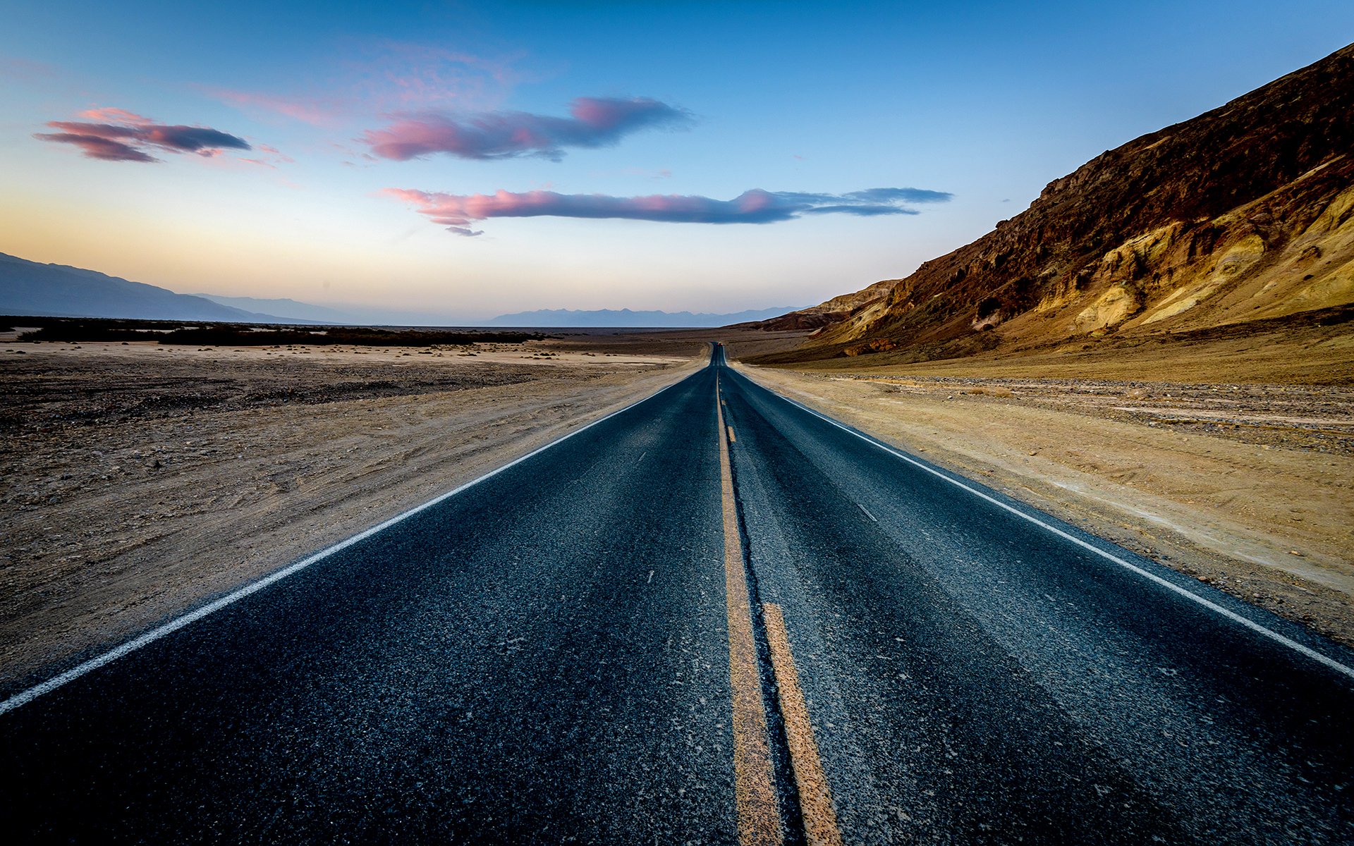 Route au coucher du soleil dans le désert avec des montagnesRoute au coucher du soleil dans le désert avec des montagnes