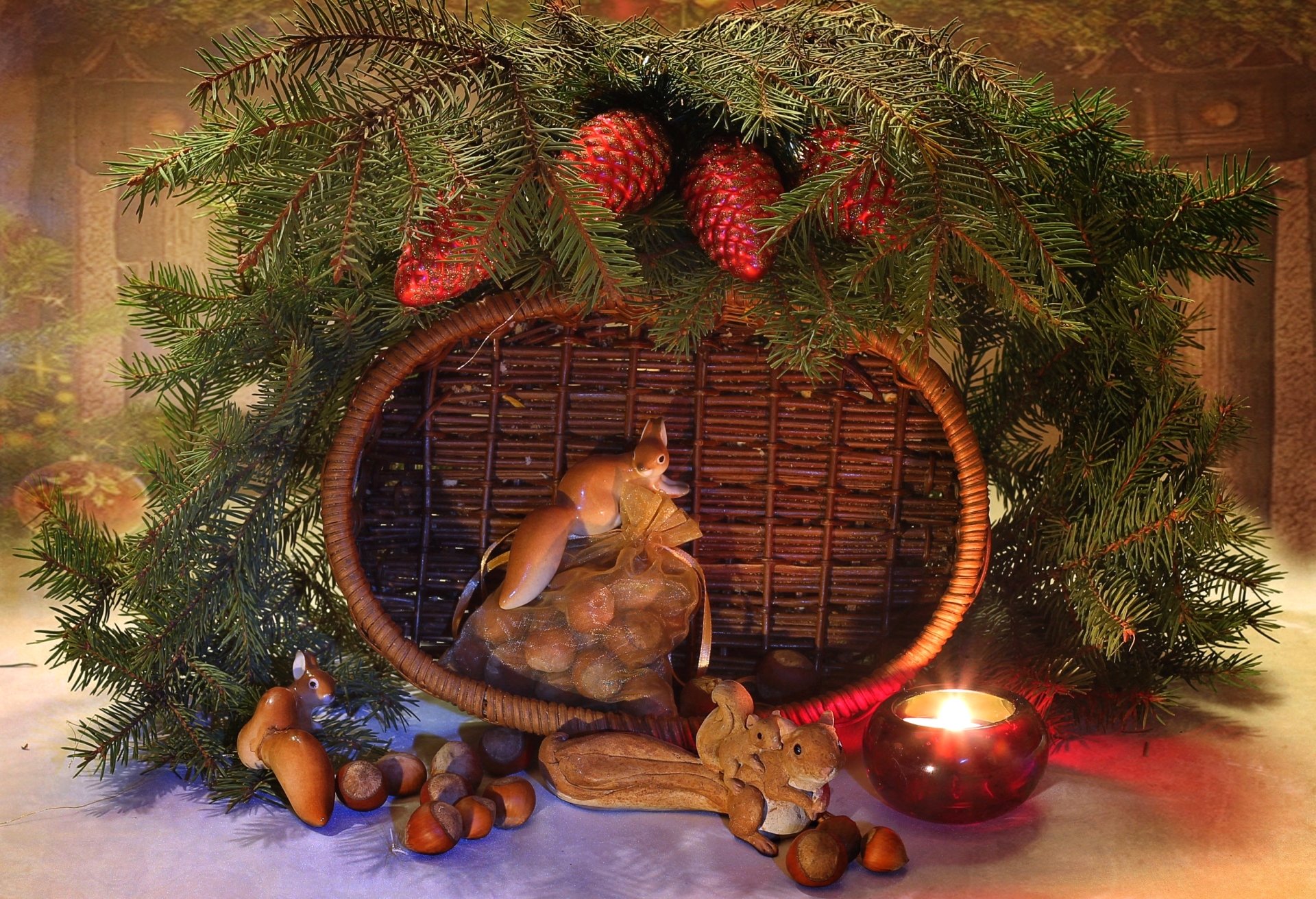 Jouets intéressants sous la forme d'écureuils, de noix et de paniers