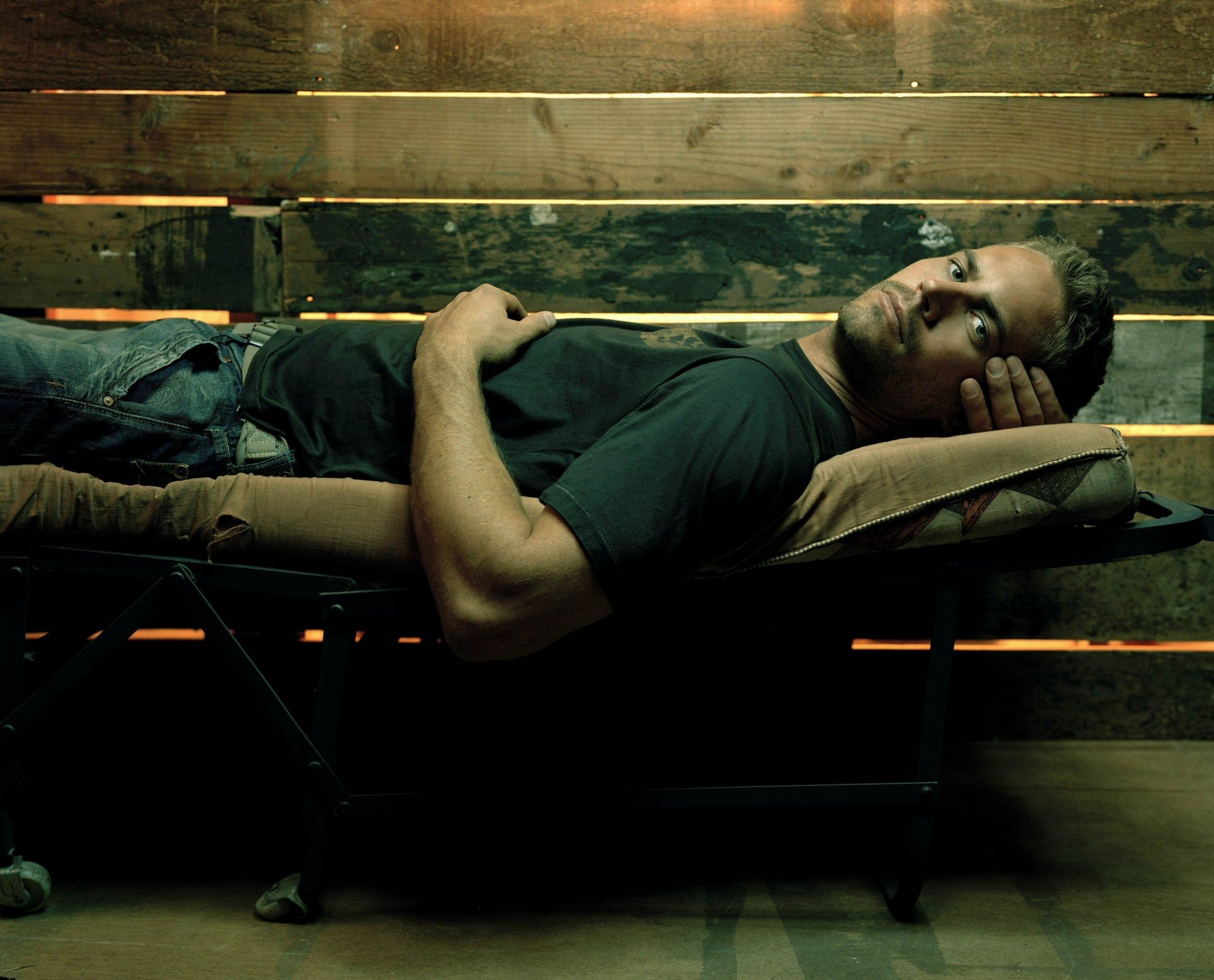 Acteur masculin Paul Walker est allongé sur un lit pliant