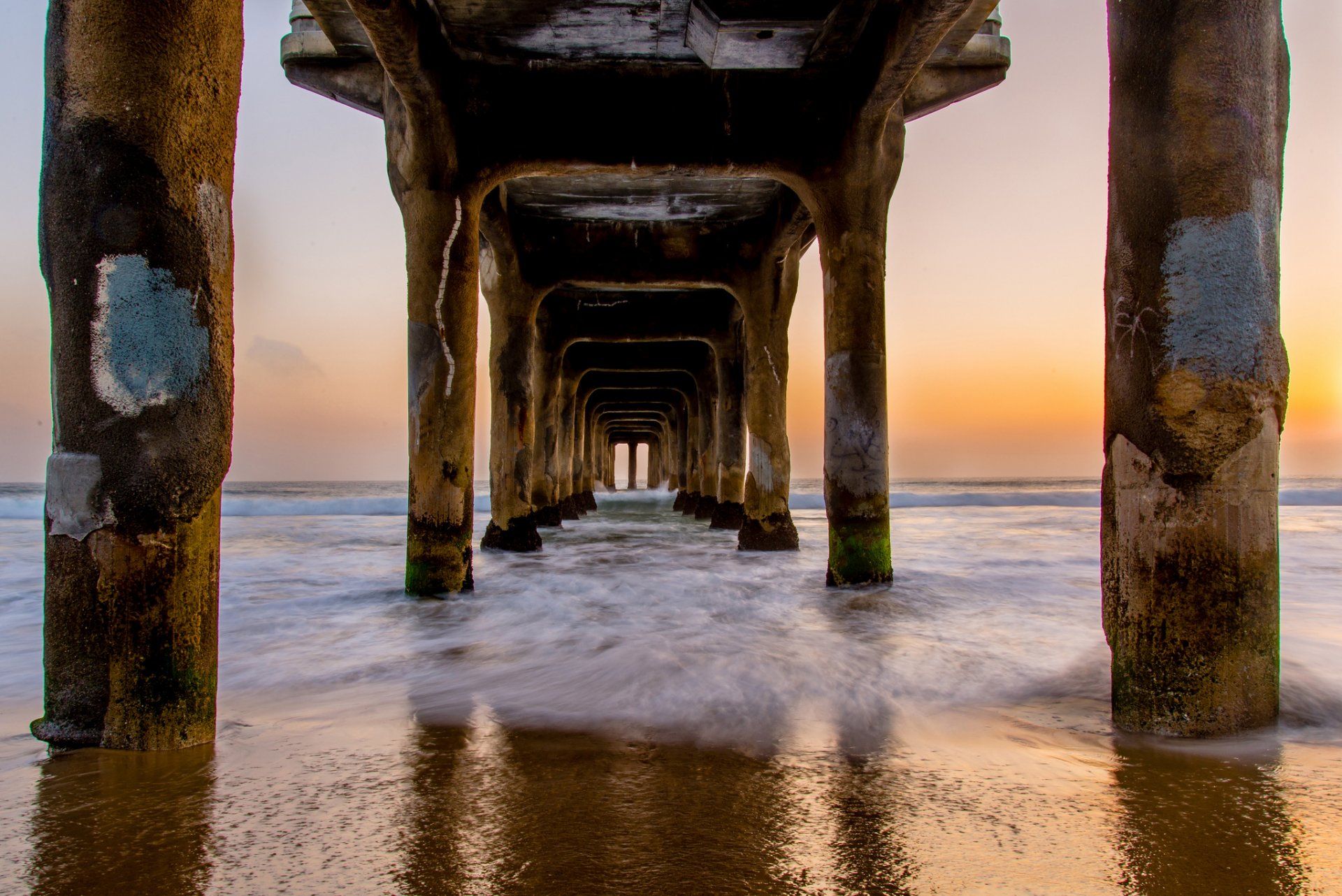 Coucher de soleil de nuit sur une jetée dans la baie des états-unisCoucher de soleil de nuit sur une jetée dans la baie des États-Unis
