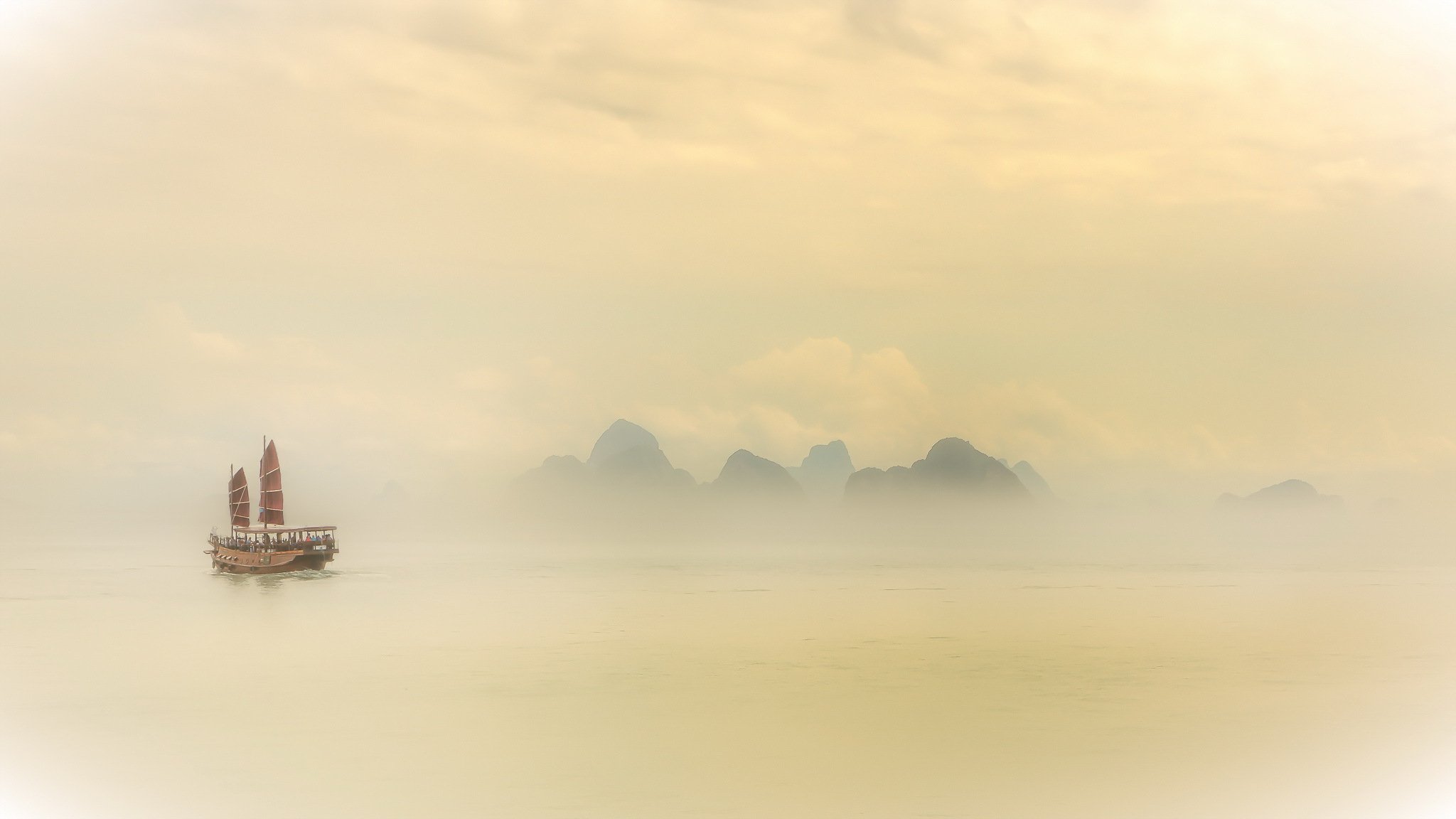 Jetée déserte et lanternes brûlantes dans le brouillardJetée déserte et lanternes brûlantes dans le brouillard