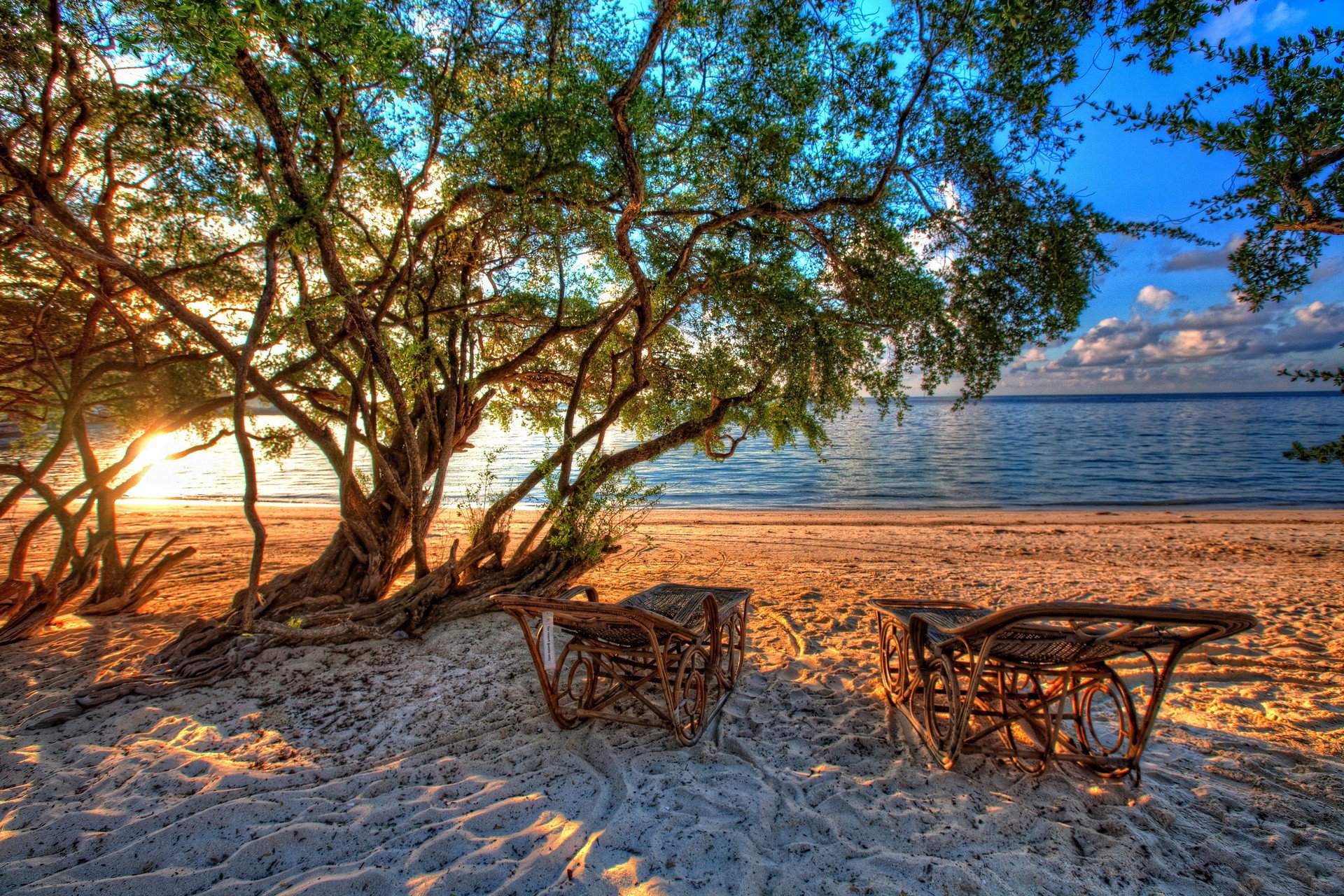 Une paire de chaises longues sculptées se dressent sur un rivage sablonneux près d'un arbre en osier et d'une rivière au-delà de laquelle le soleil se coucheUne paire de chaises longues sculptées se dressent sur un rivage sablonneux près d'un arbre en osier et d'une rivière au-delà de laquelle le soleil se couche