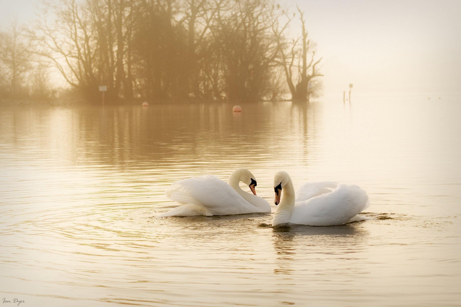 Paire de cygnes blancs par jour brumeux