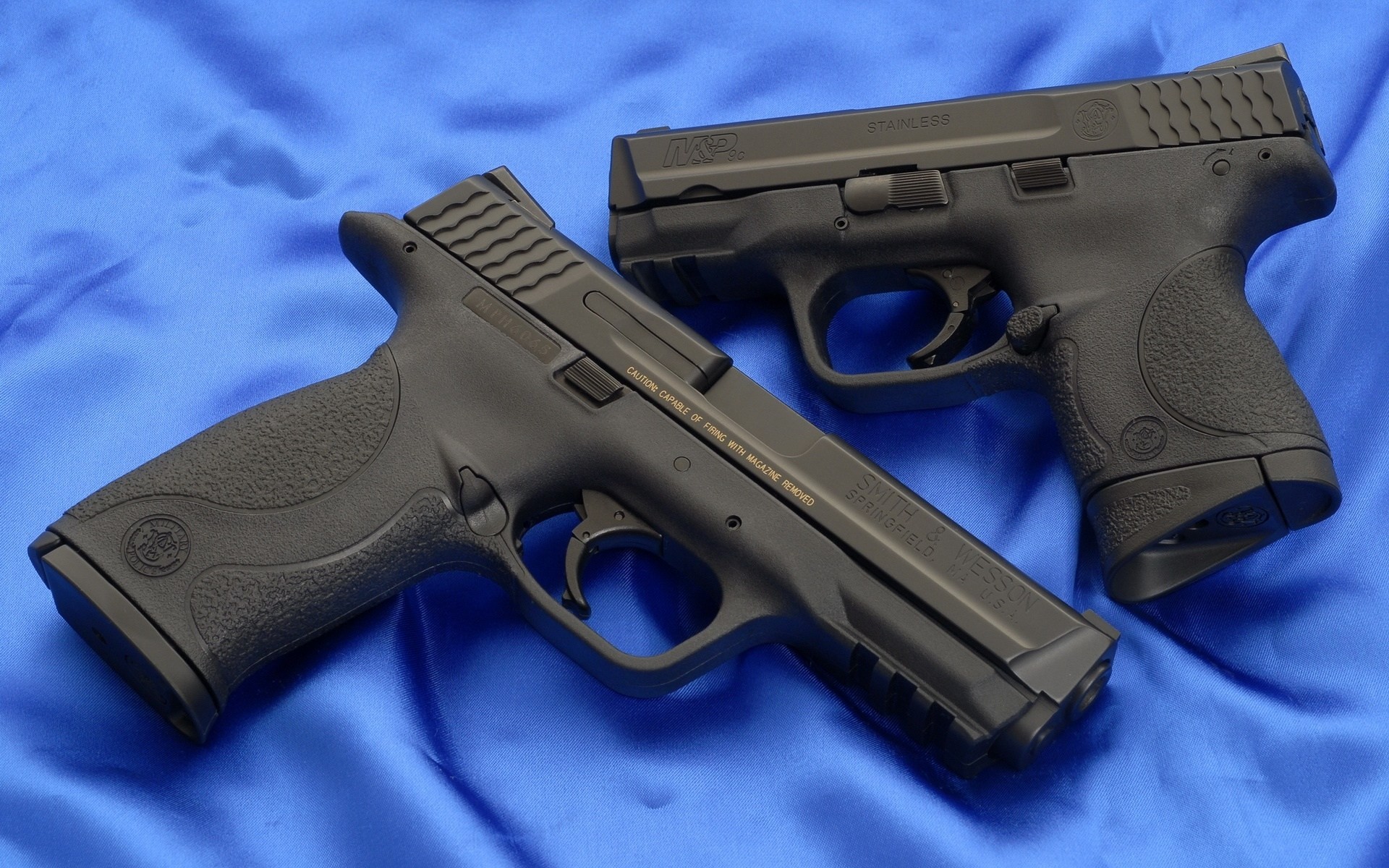 Deux pistolets de police noirs sur fond de tissu bleuDeux pistolets de police noirs sur fond de tissu bleu