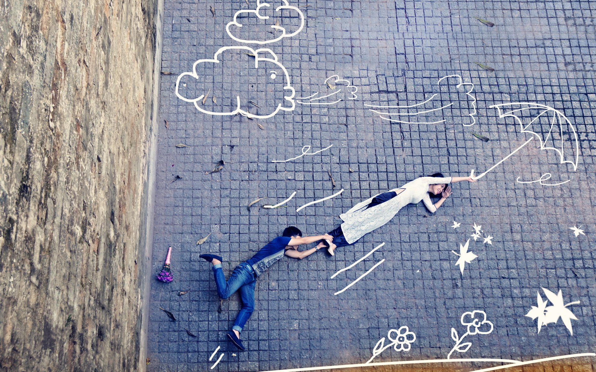 Sur l'asphalte, des figures dessinées à la craie tiennent un gars et une filleSur l'asphalte, des figures dessinées à la craie tiennent un gars et une fille