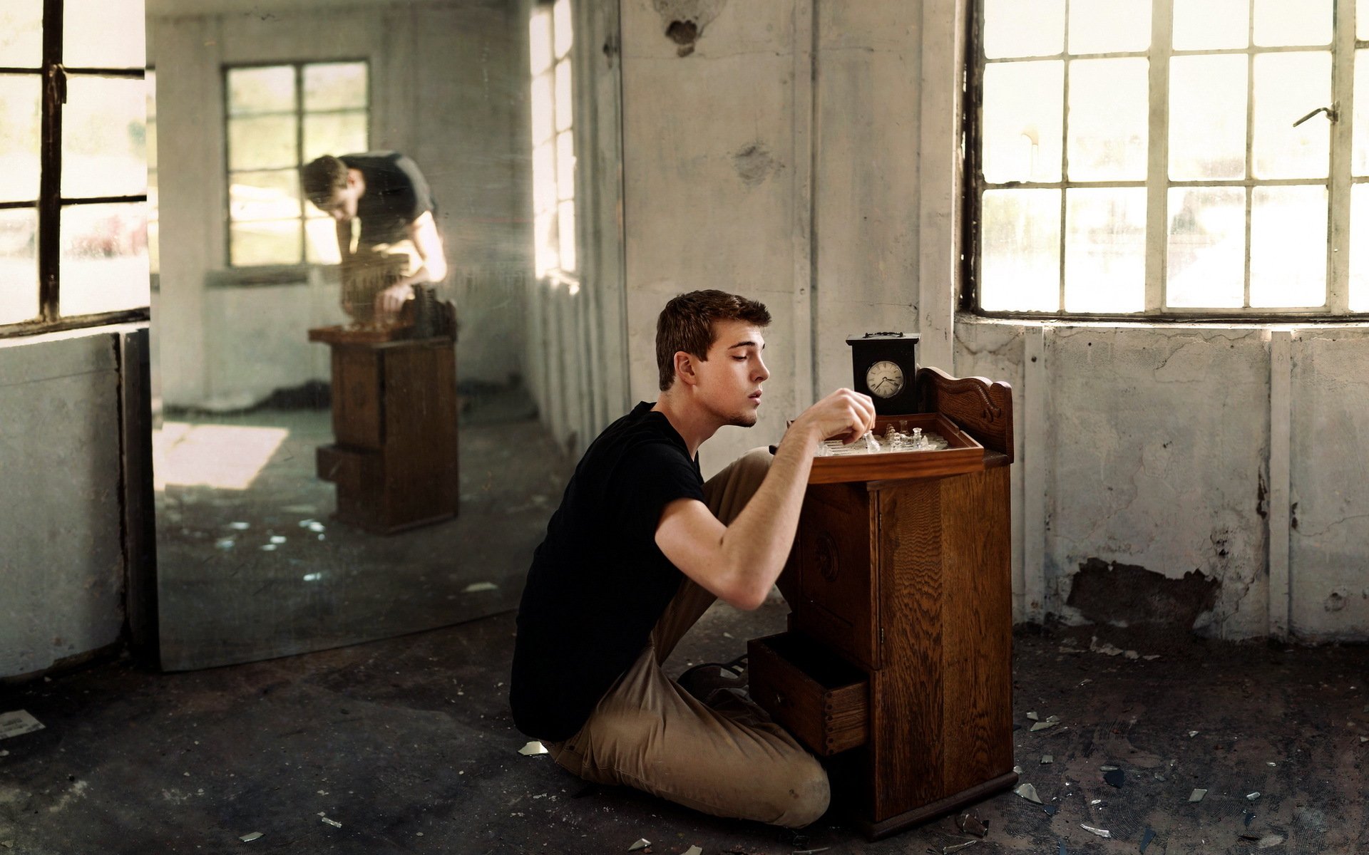 Un gars dans une maison abandonnée joue aux échecs avec son refletUn gars dans une maison abandonnée joue aux échecs avec son reflet