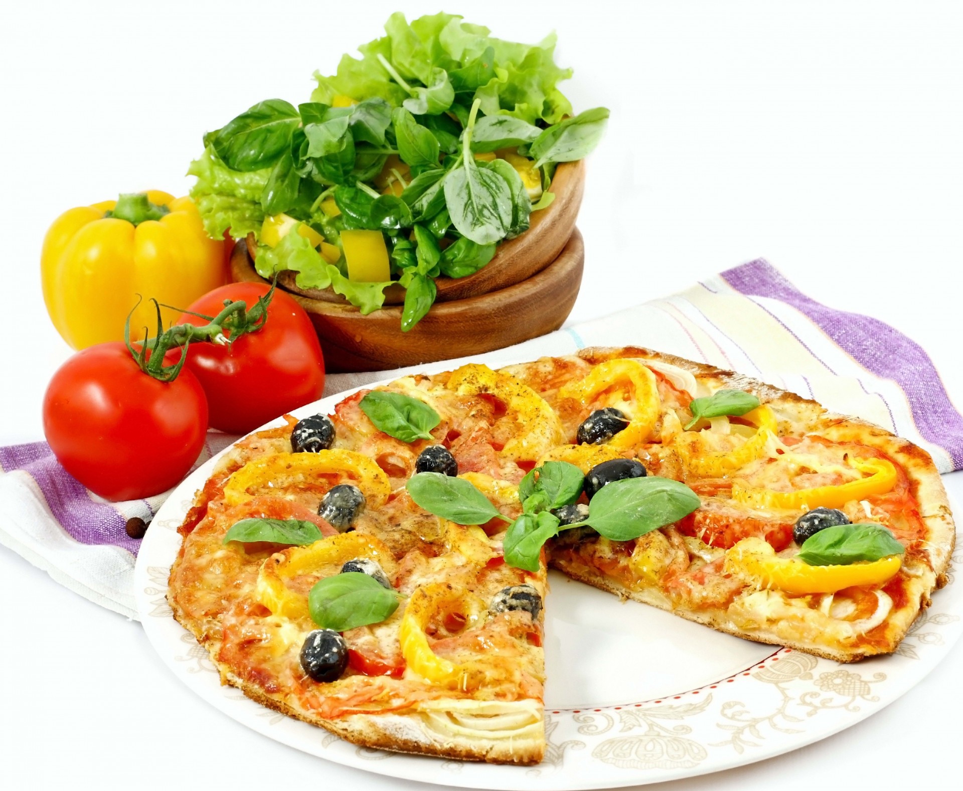 Sur un fond blanc se trouve une pizza avec de délicieux légumesSur un fond blanc se trouve une pizza avec de délicieux légumes