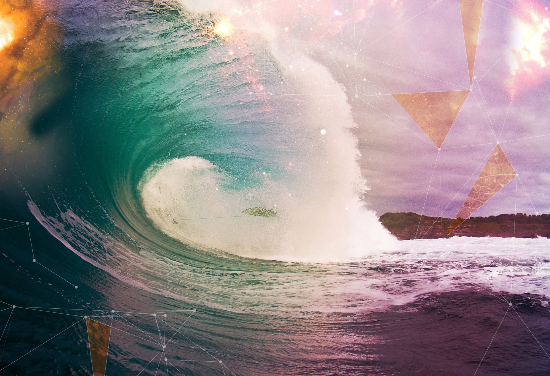 Maison de vacances avec toit de chaume parmi les palmiers et les vagues de la merMaison de vacances avec toit de chaume parmi les palmiers et les vagues de la mer