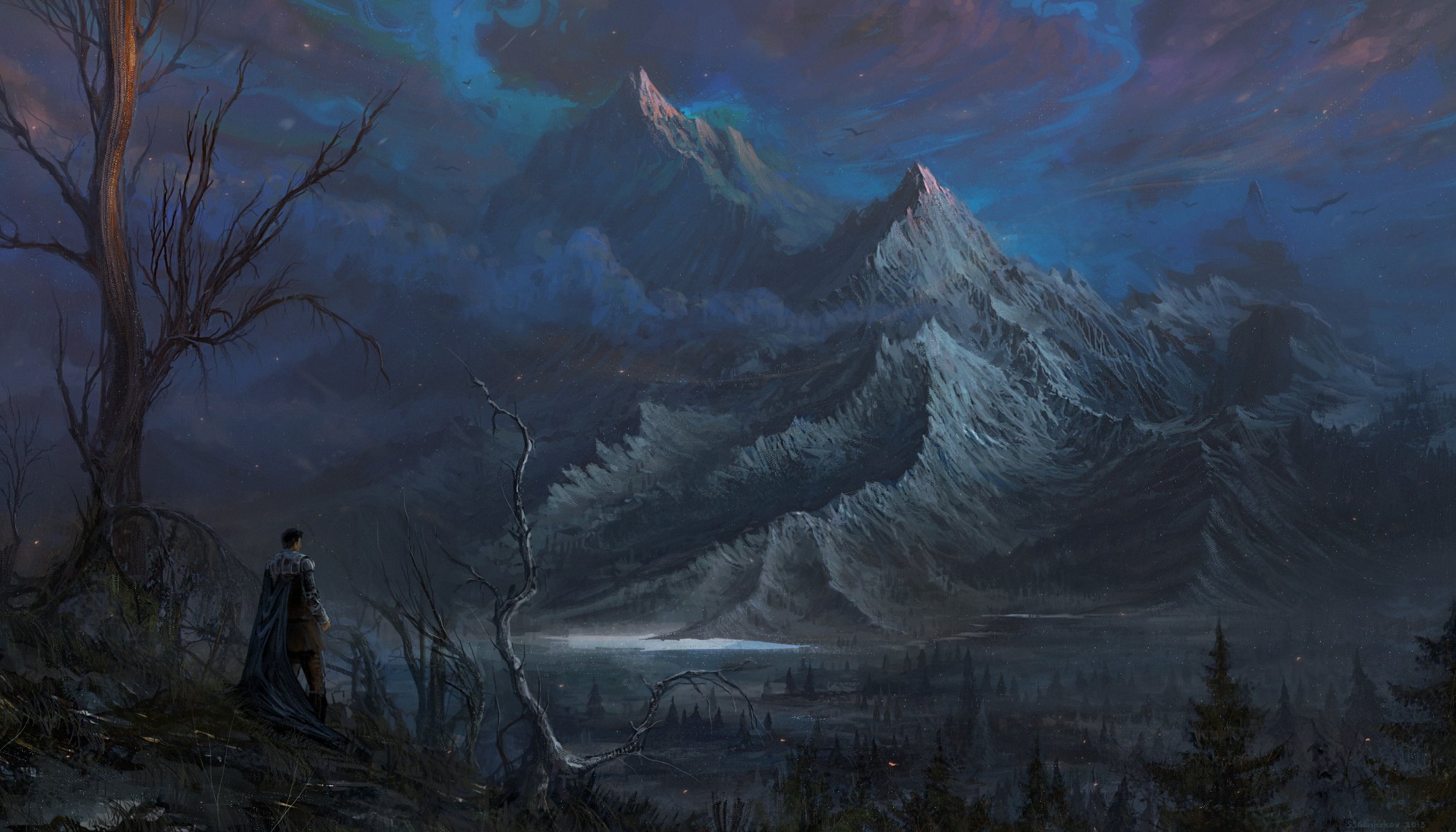 Chevalier solitaire près de l'arbre dans la forêt sur fond de montagnesChevalier solitaire près de l'arbre dans la forêt sur fond de montagnes