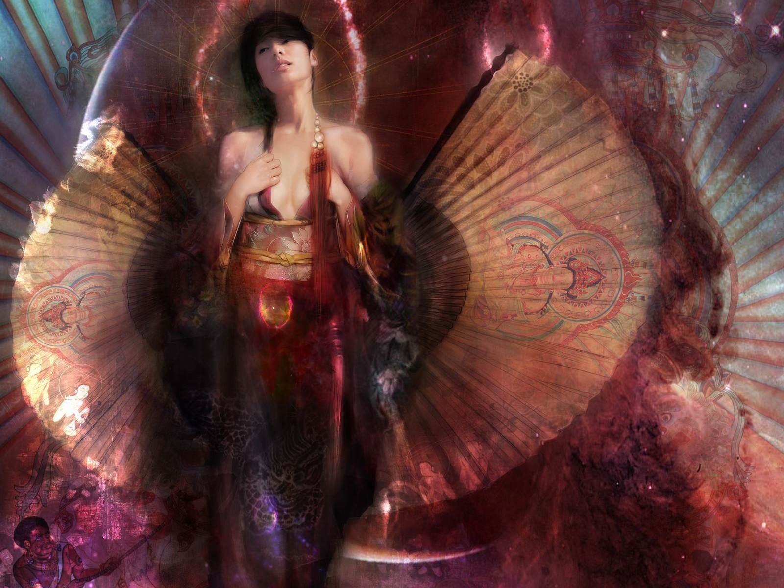 Photo en noir et blanc d'une fille japonaise avec un ventilateur derrière son dos