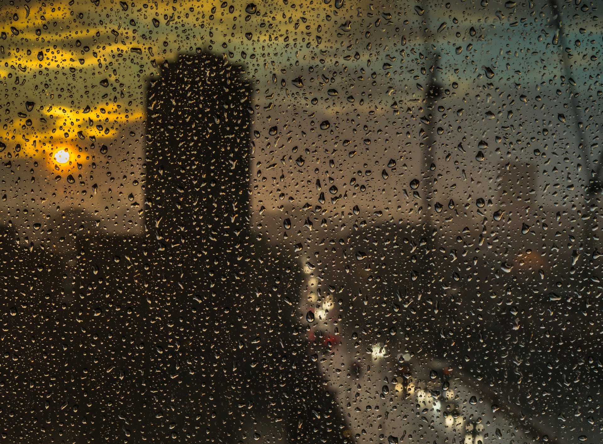 Coucher de soleil dans un jour de pluie à travers le verre
