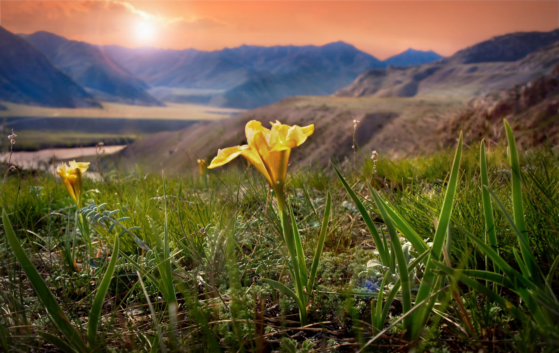 Fleur jaune, jeune herbe verte sur fond de montagnesFleur jaune, jeune herbe verte sur fond de montagnes