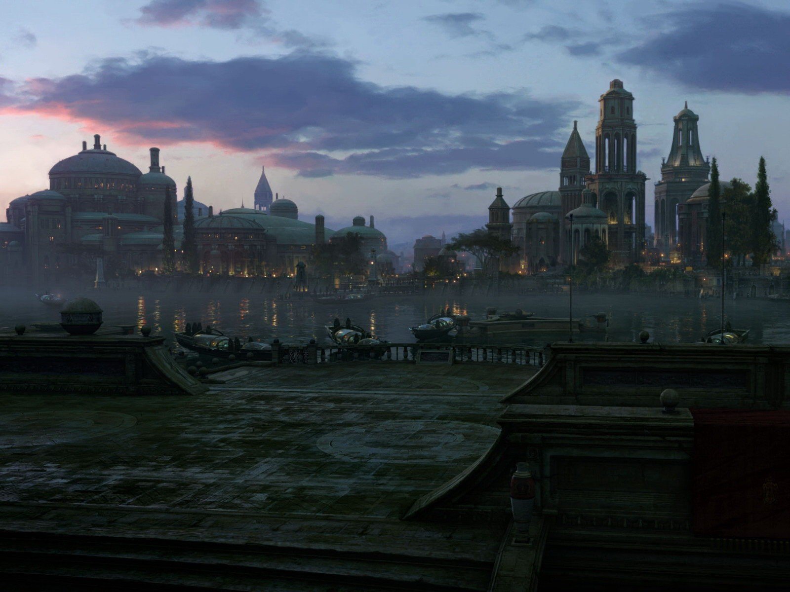Bateaux dans la soirée sur le quai - fond d'écran de bureau