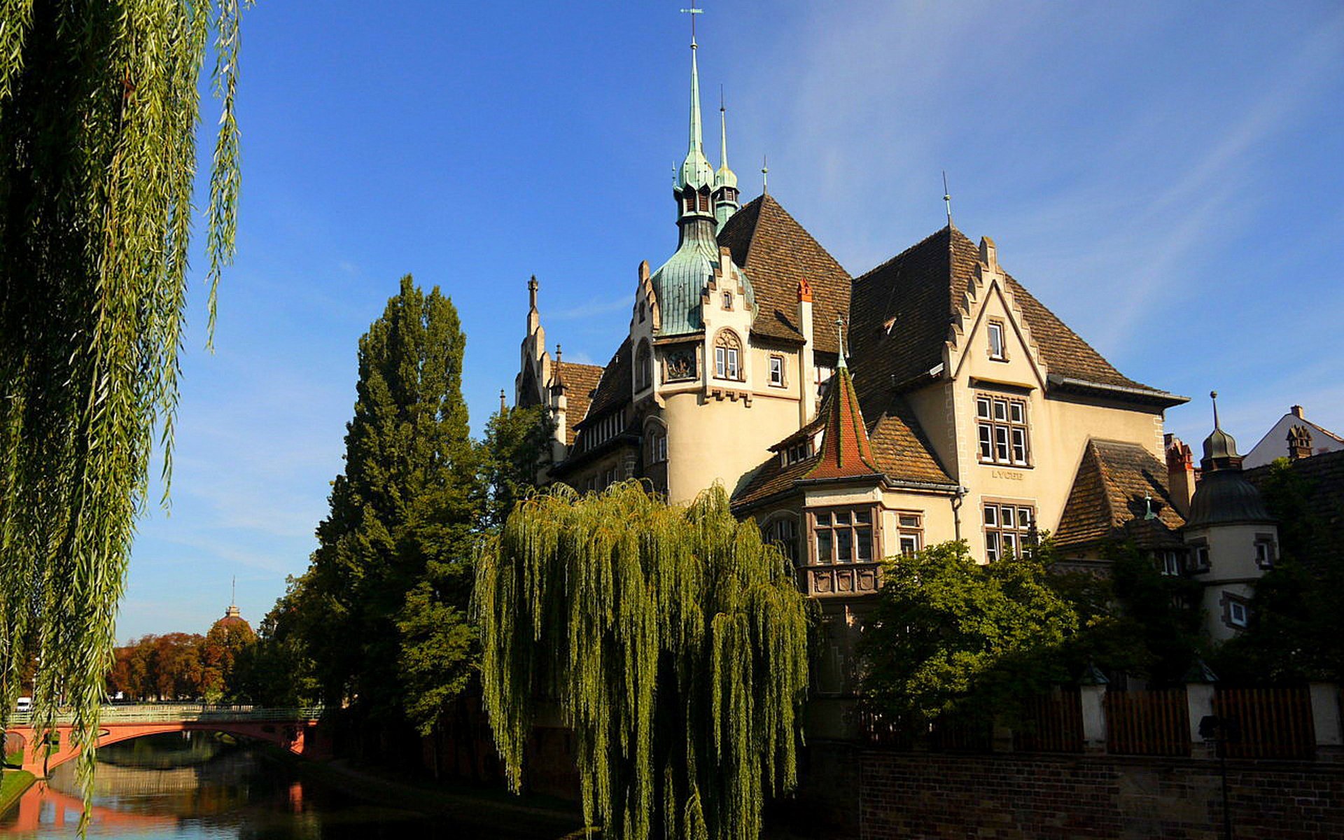 Tags:bâtiment, arbres, pont, eau